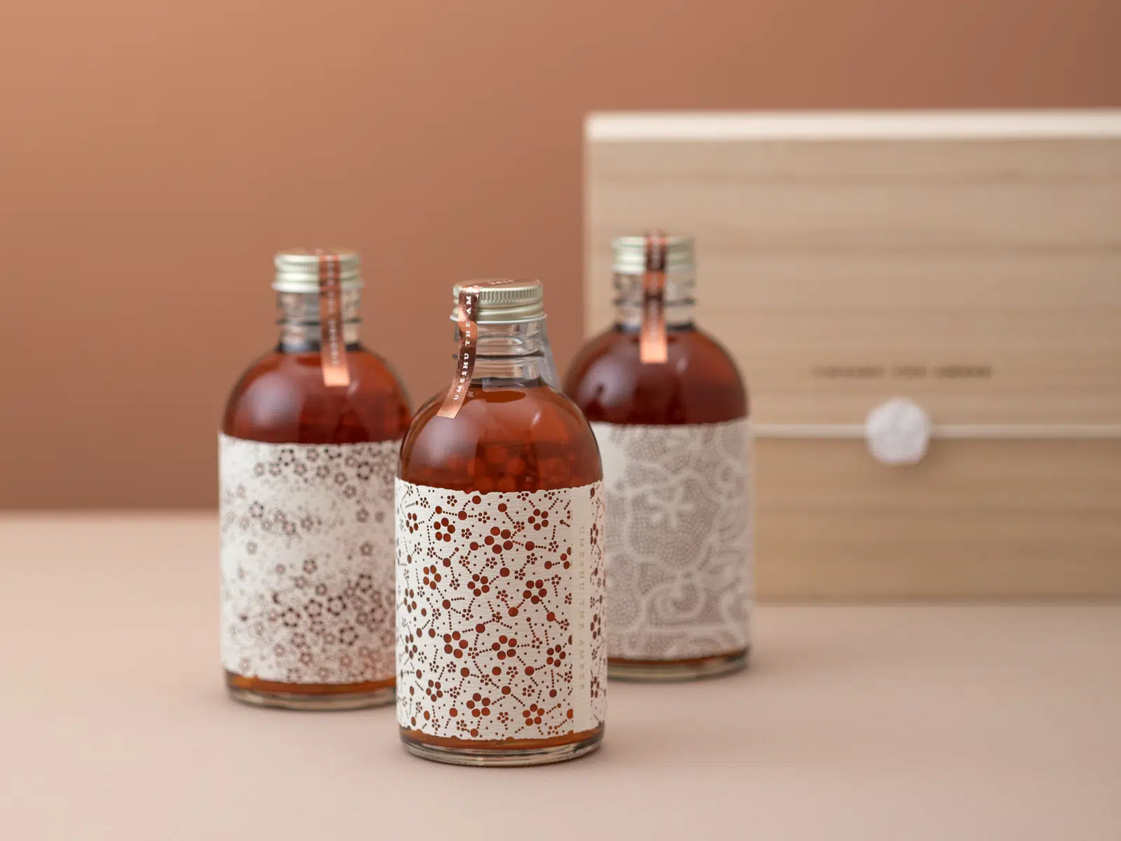 “UMESHU THE AMBER”は、厳選された紀州の梅を使用した長期熟成ヴィンテージ梅酒です。ボトルを包む白いラベルは、紀州文化の一つである和服の染め型紙の梅文様をモチーフにしたデザインで、「新だん紙」をレーザーカットで抜いています。
