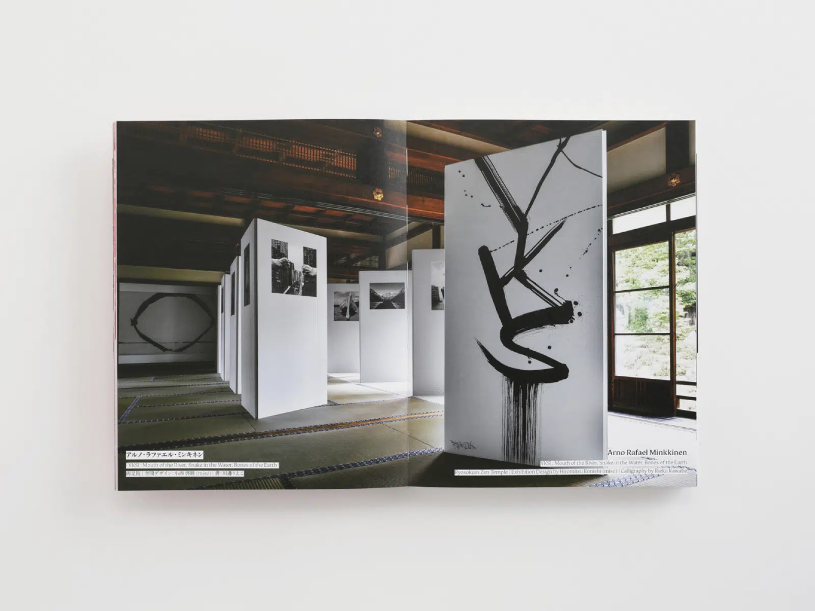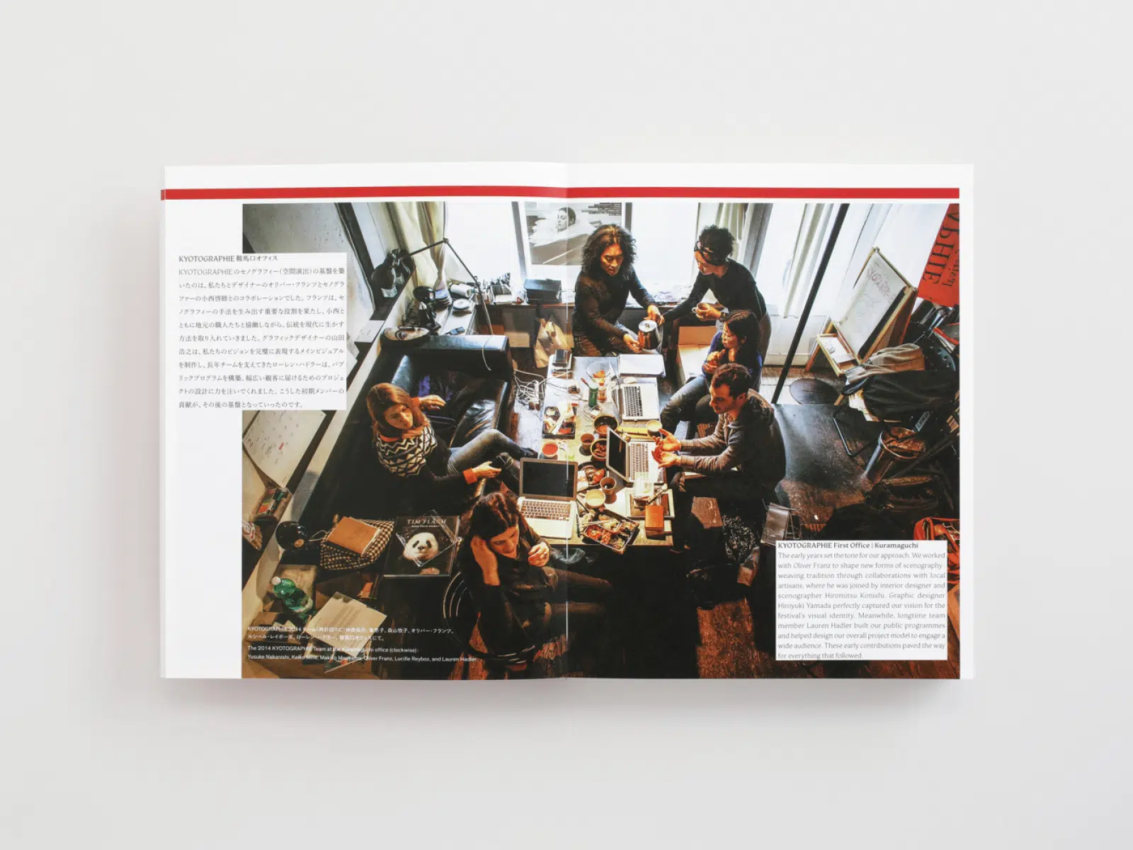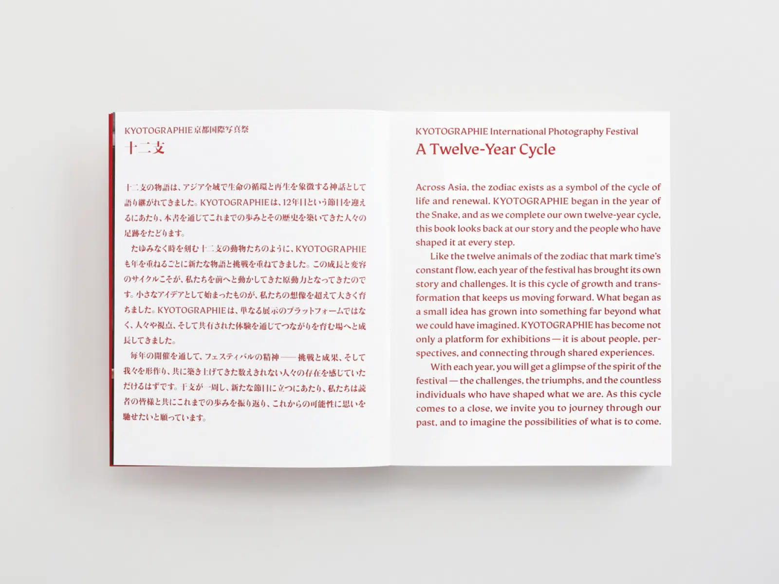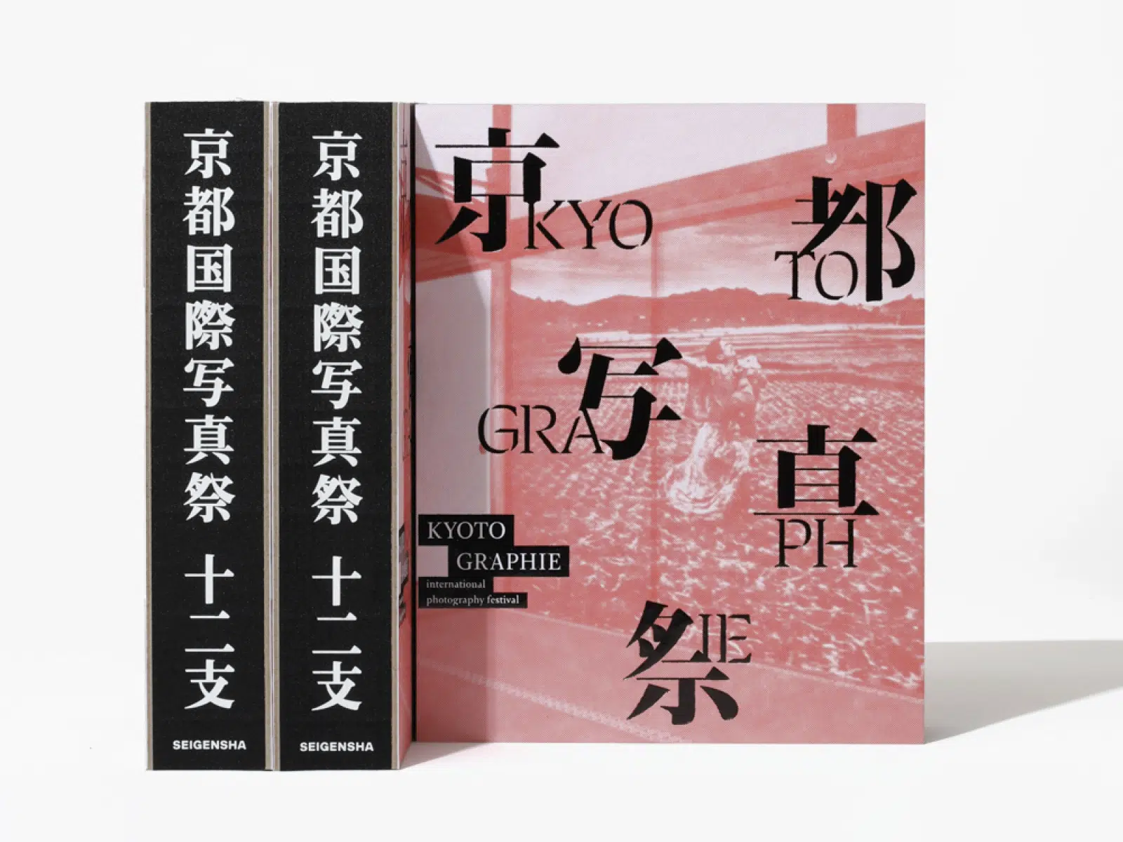 KYOTOGRAPHIEの12周年を記念し、その誕生から現在までを一冊にまとめた本。表紙では、日本(京都)とグローバルという写真祭が持つ2つの側面をタイポグラフィで表現した。更に細江英公の展示写真を「グムンドハイディ」に印刷することで、質感のある仕上がりとなった。読者に写真祭の空気感がより身近に伝わるように、本文にはテクスチャーのある紙「アラベール-FS」を選んだ。扉にKYOTOGRAPHIEのイメージカラーである赤の「プライク-FS」を使用することで、全体的に締まりのあるデザインになったと思う。(山田浩之さん)