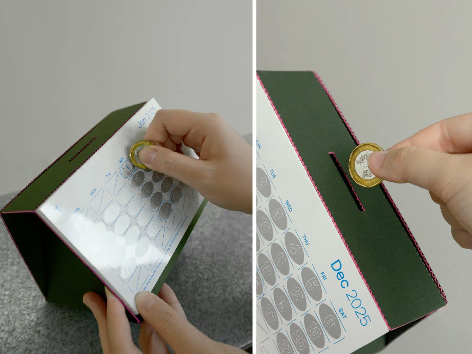 For us, this product—the calendar—isn’t just about dates; it’s also about the ritual of saving. The coin bank aspect deserved a vessel that felt both purposeful and elevated. Using TAKEO’s Fine Flute® and E-flute was a natural choice—practical and creative in equal measure. (Azelia Ng)