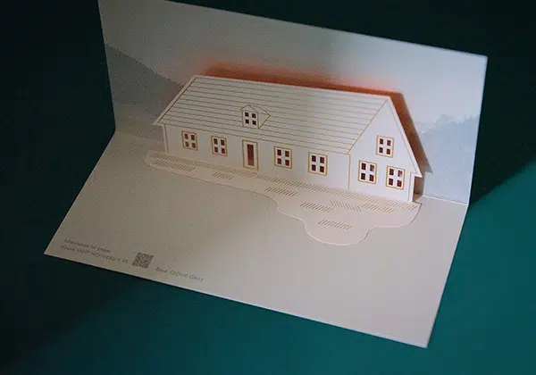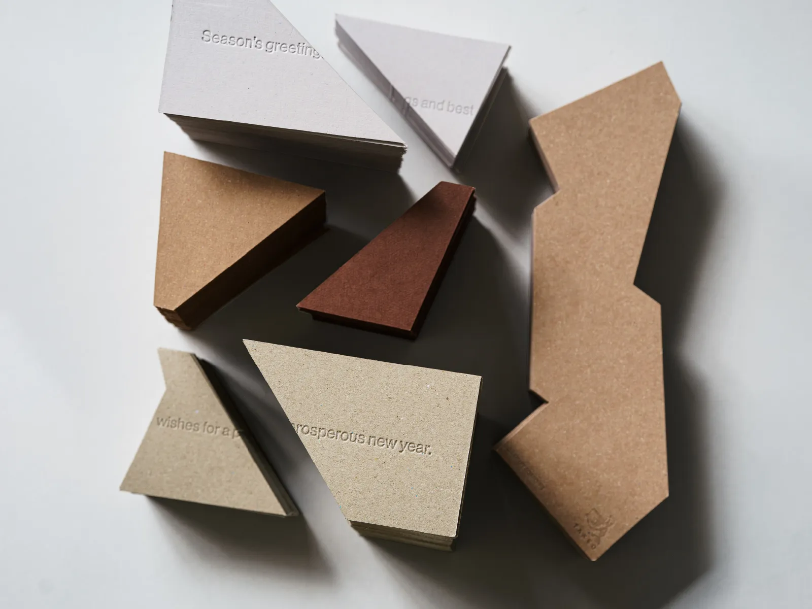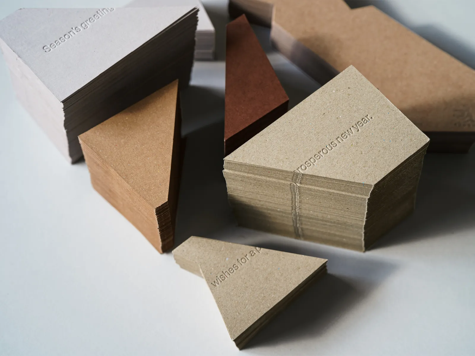 そこで、貼合の枚数を調整して各パーツに異なる厚みを持たせ、手作業で組み上げることで、一枚の厚紙をひねり折ったようなメッセージカードに仕立てました。素材の魅力を形態そのものから感じ取れる仕上がりを目指しています。(大原健一郎さん)
