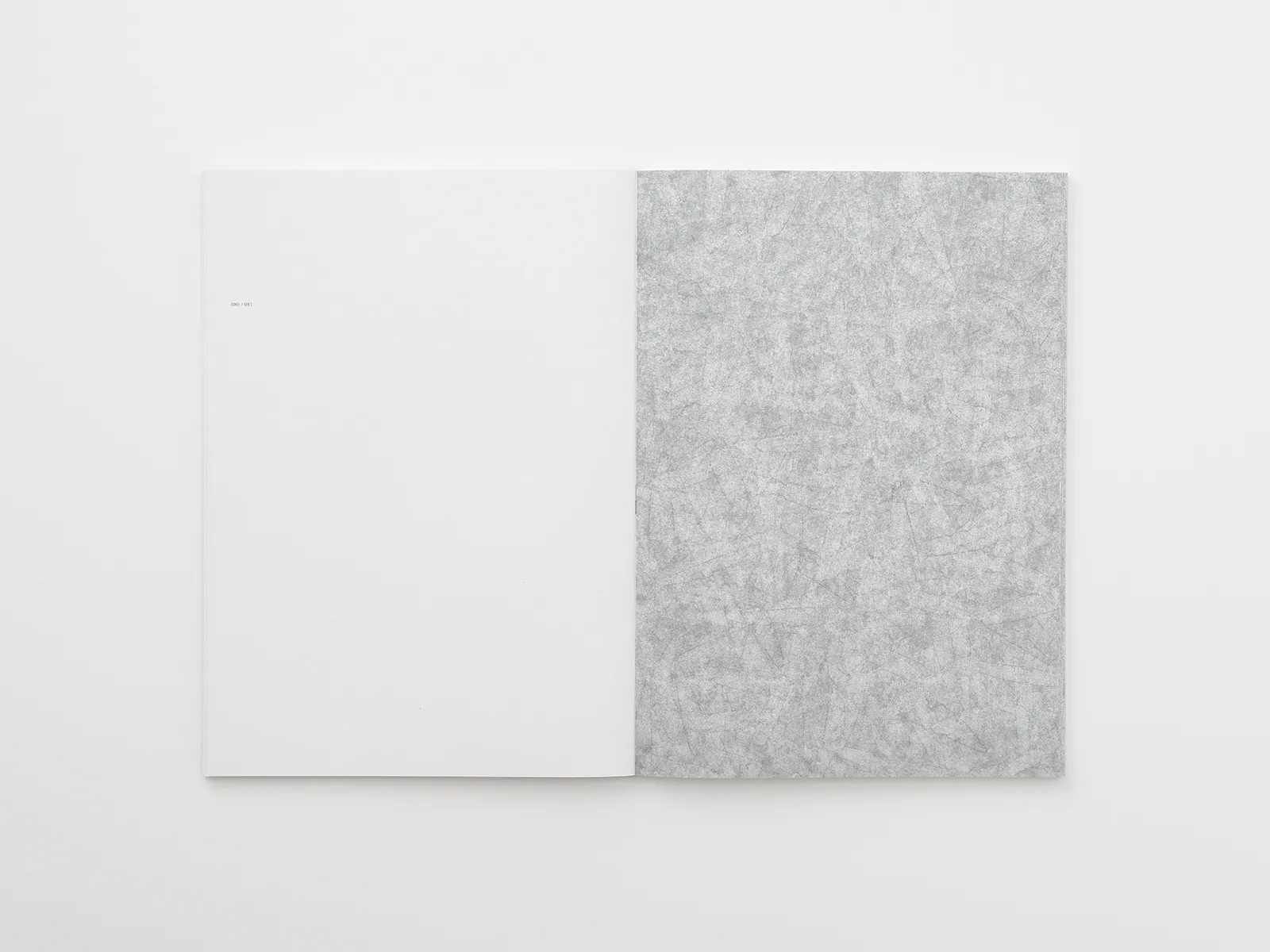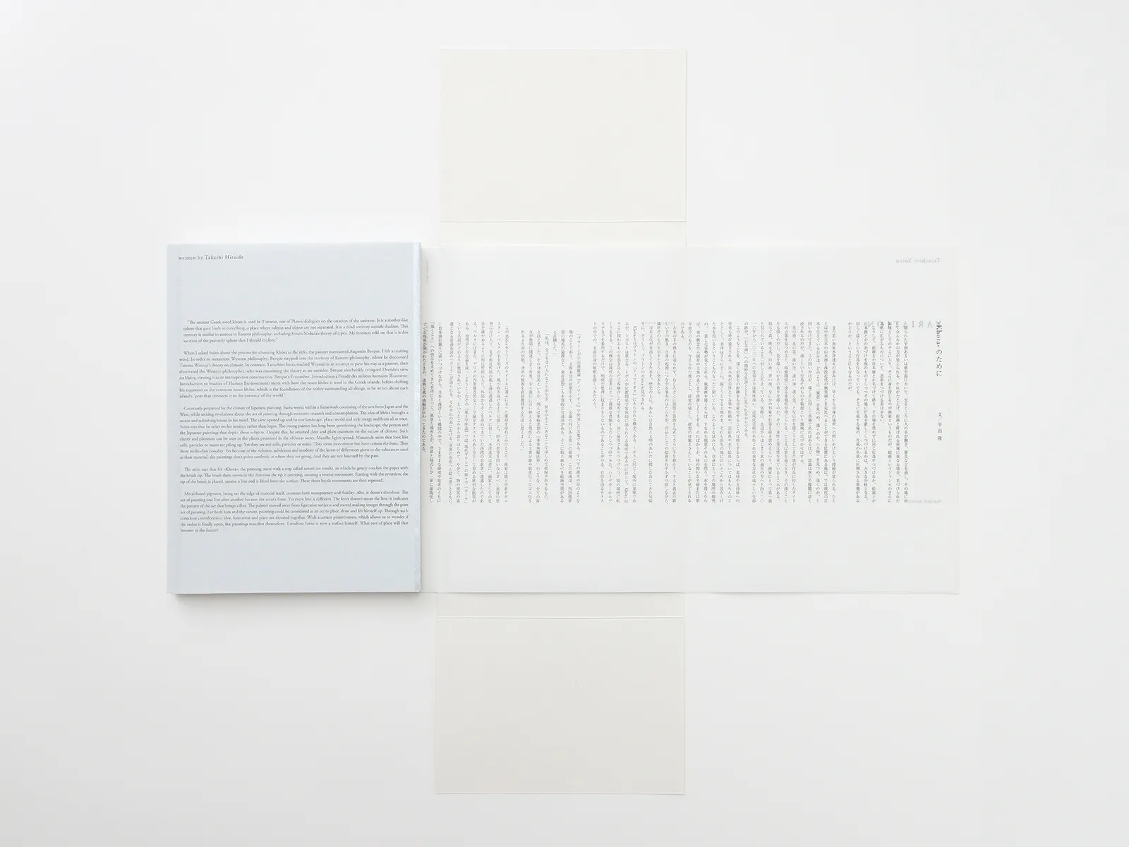 本という以前に、ひとつの物質・オブジェとして成立させることを意識し、作品に用いた銀に呼応する素材として「スタードリーム-FS シルバー」を選定しました。カバーは、アルミニウムという西洋的素材と、墨という東洋的素材が幾重もの筆致によって折り重なっていく制作過程のイメージを、装丁においてもヴィジュアライズできないかと考え、縦組み(東洋)と横組み(西洋)が重なり合う構成にし、透過性のある紙を選びました。手に取った際の質感を考慮し、最終的に「MBSテックA」としました。(山口信博さん)