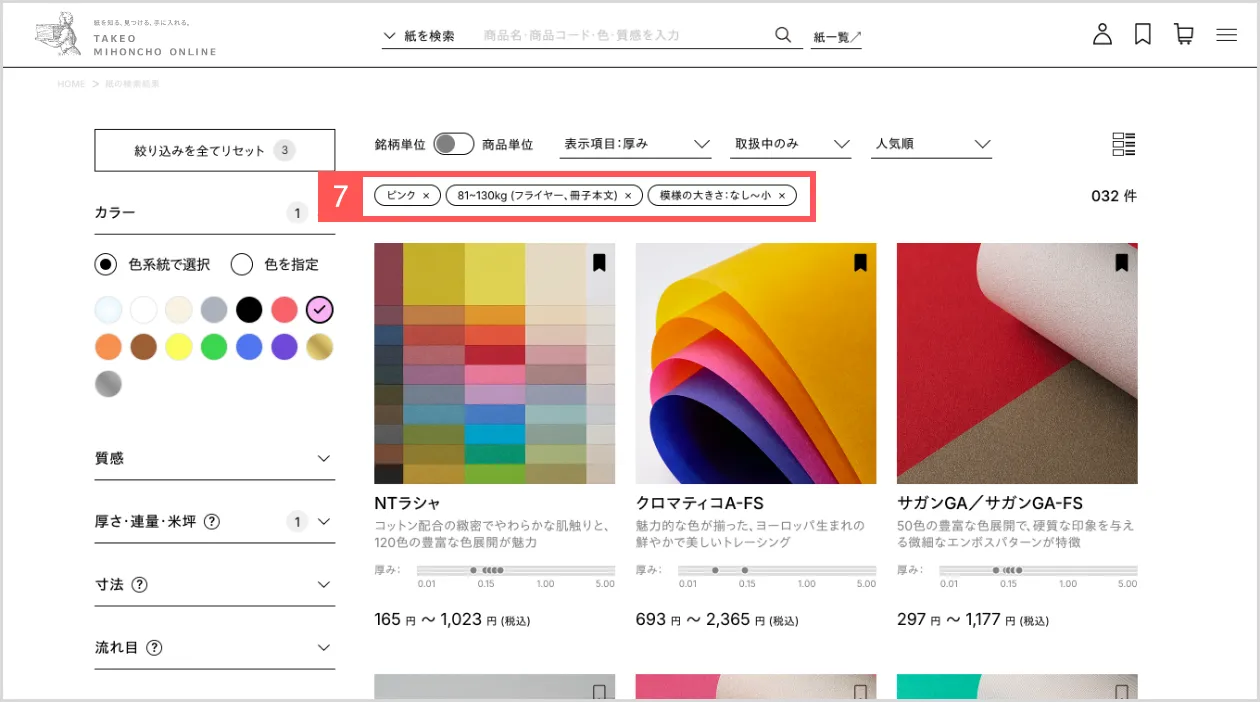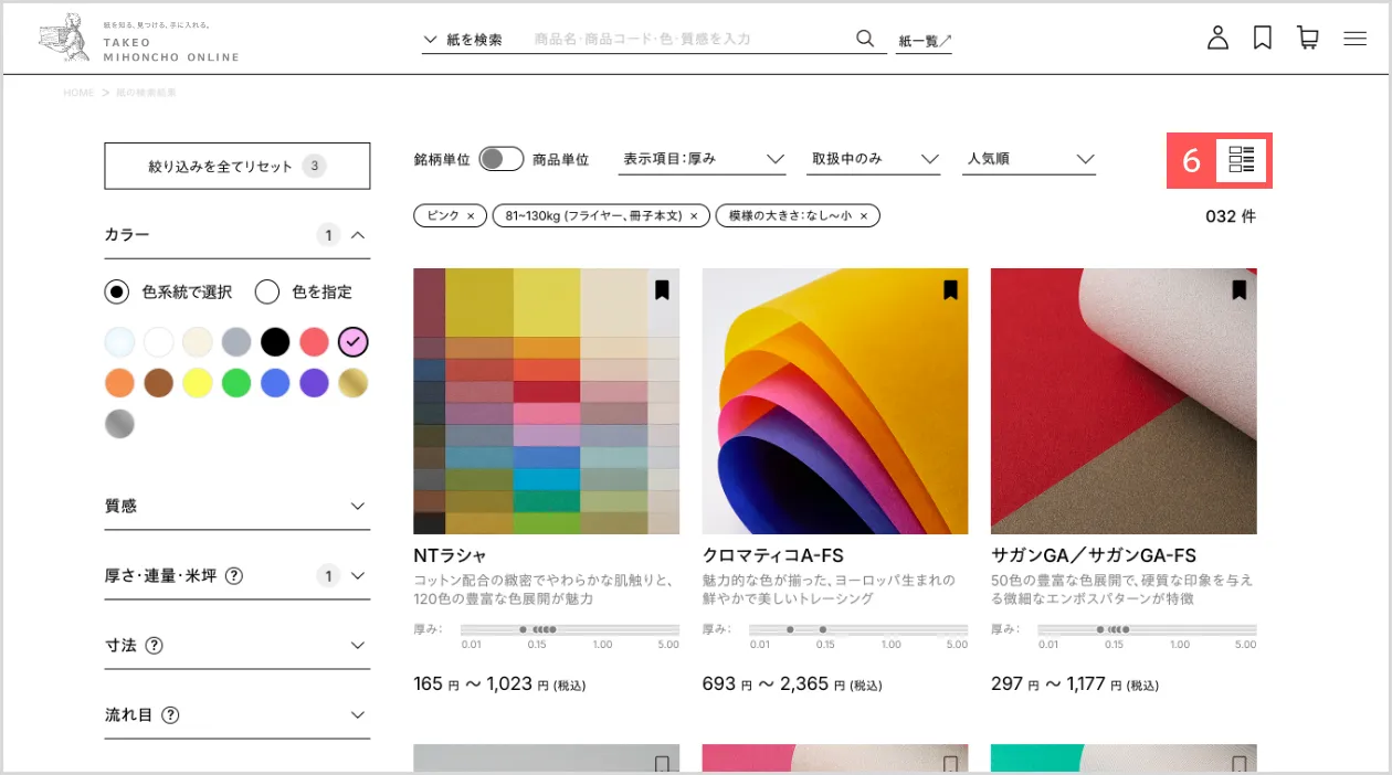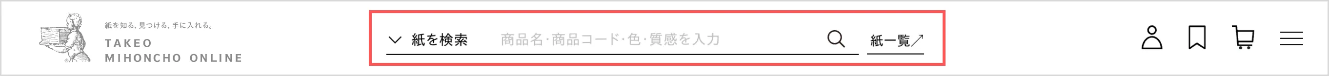 各ページのヘッダーにある検索窓で「紙を検索」が選択された状態にして銘柄名やキーワード、商品コードなどを入れて検索、もしくは紙一覧をクリックすることで紙の検索画面に移動できます。