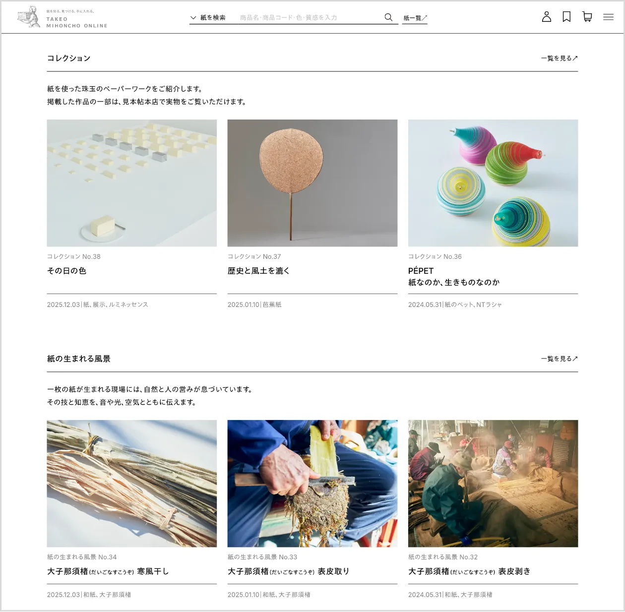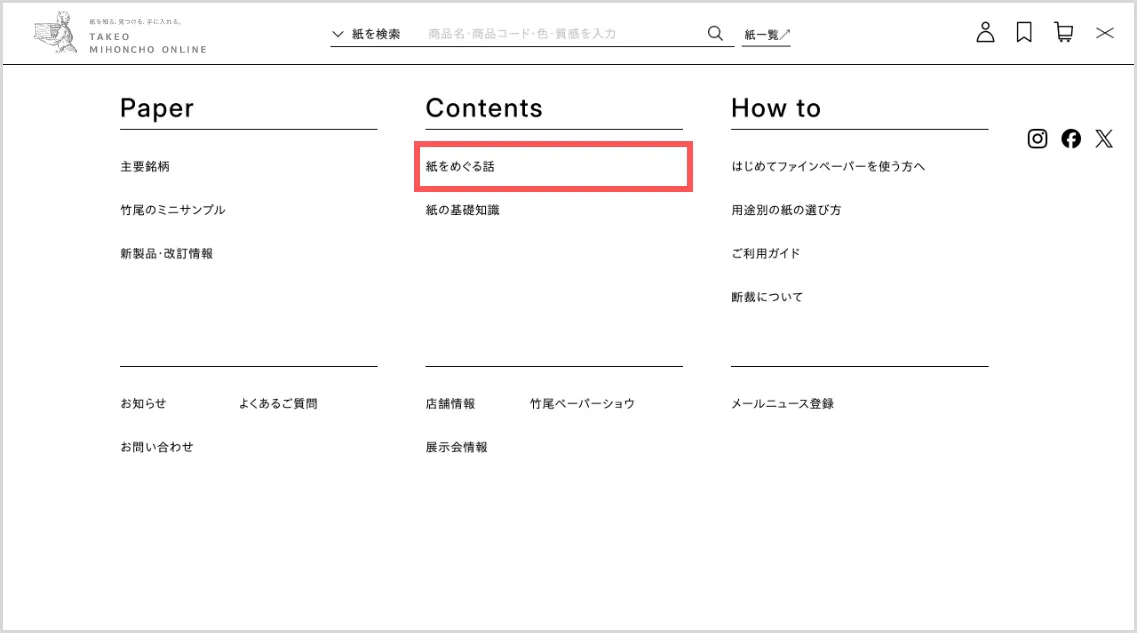 竹尾のニュースレター『PAPER’S』をはじめ、竹尾や紙にまつわるさまざまな記事を「紙をめぐる話」ページで紹介しています。TOPページのREADINGSにある記事一覧や右上のハンバーガーメニューから「紙をめぐる話」をクリックすると、一覧ページに遷移することができます。