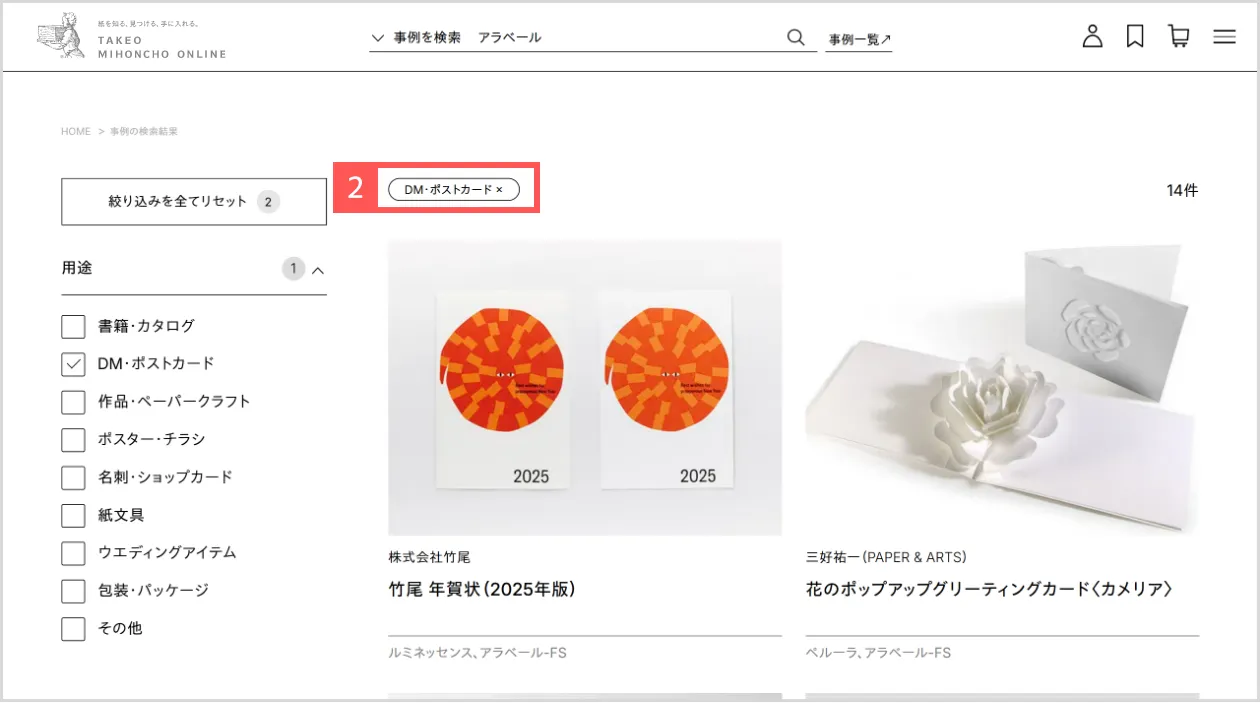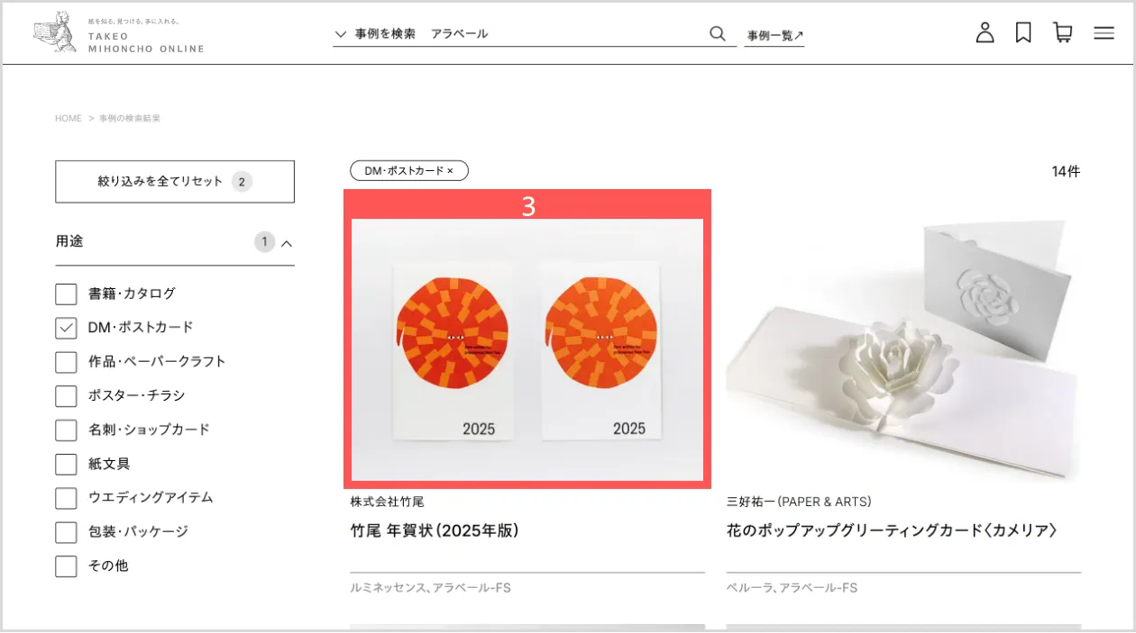 用途、印刷方法、加工方法、製本方法の条件を絞り込んで検索することができます。