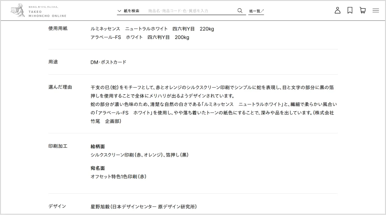 採用した紙とその選定理由、加工情報なども併せてお聞きしています。