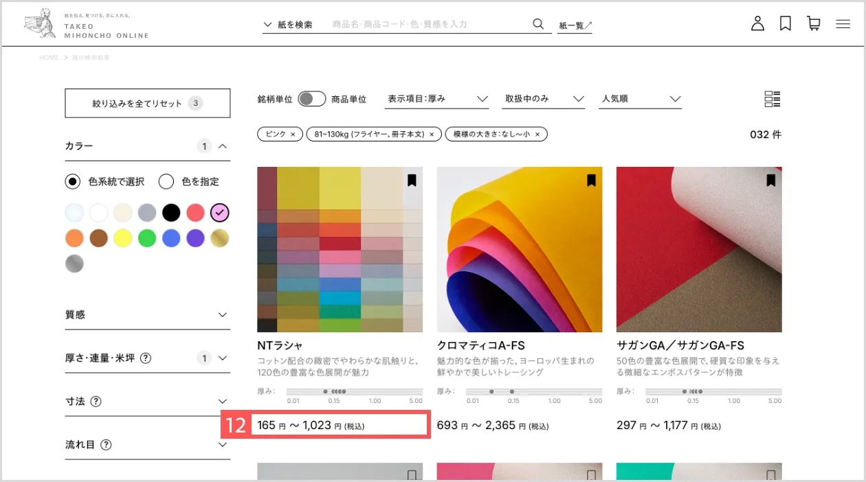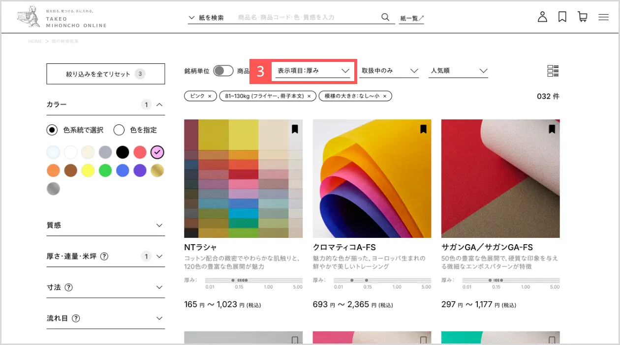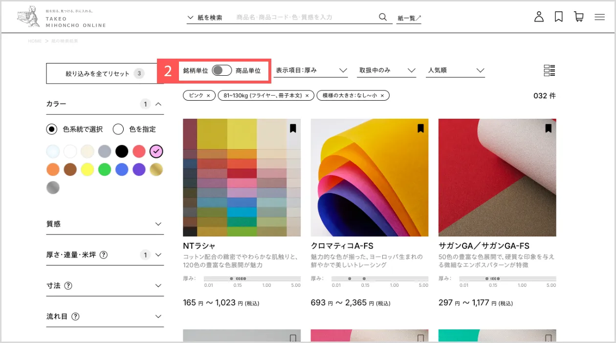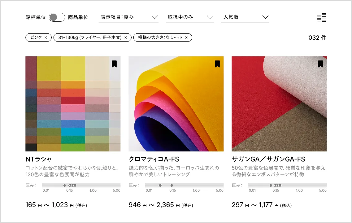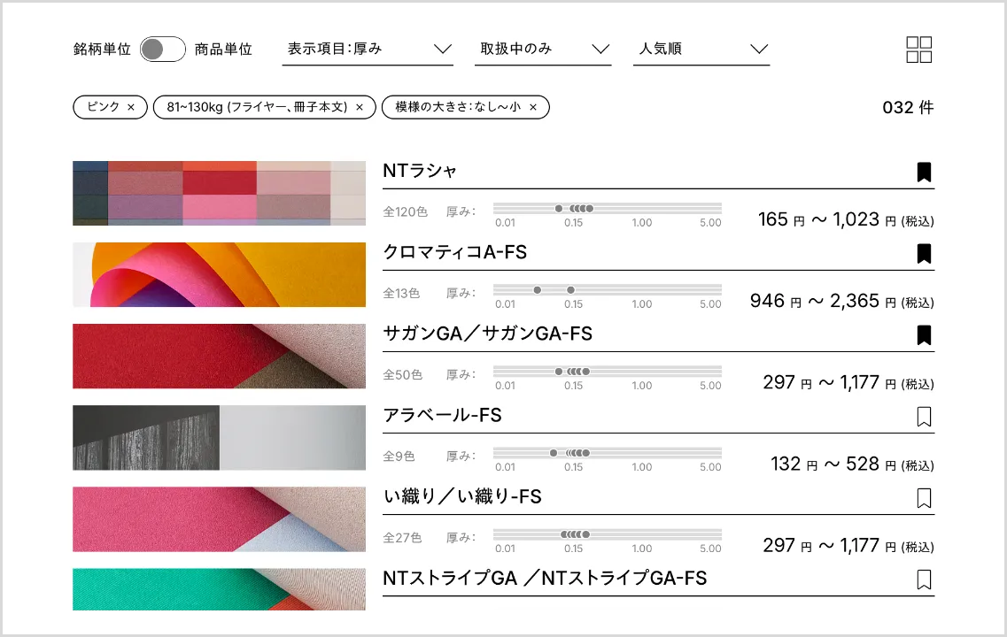 商品単位表示時は人気順、五十音順、トーン順、新着順、価格の安い順、価格の高い順、薄い順、厚い順で並び替えることができます。