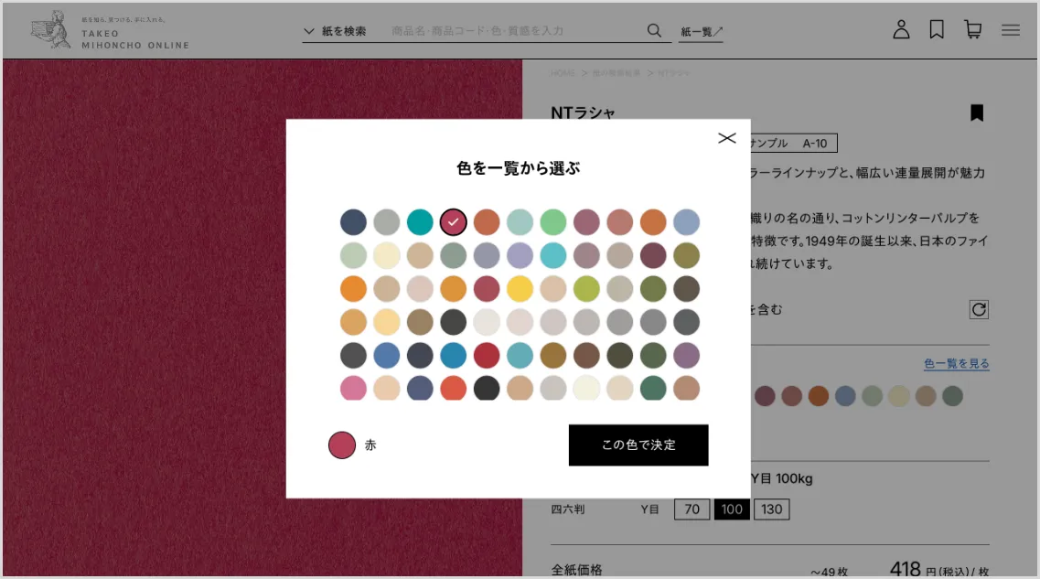 お客様のご希望される色、質感、寸法、厚さなどから紙を絞り込んで検索することができます。