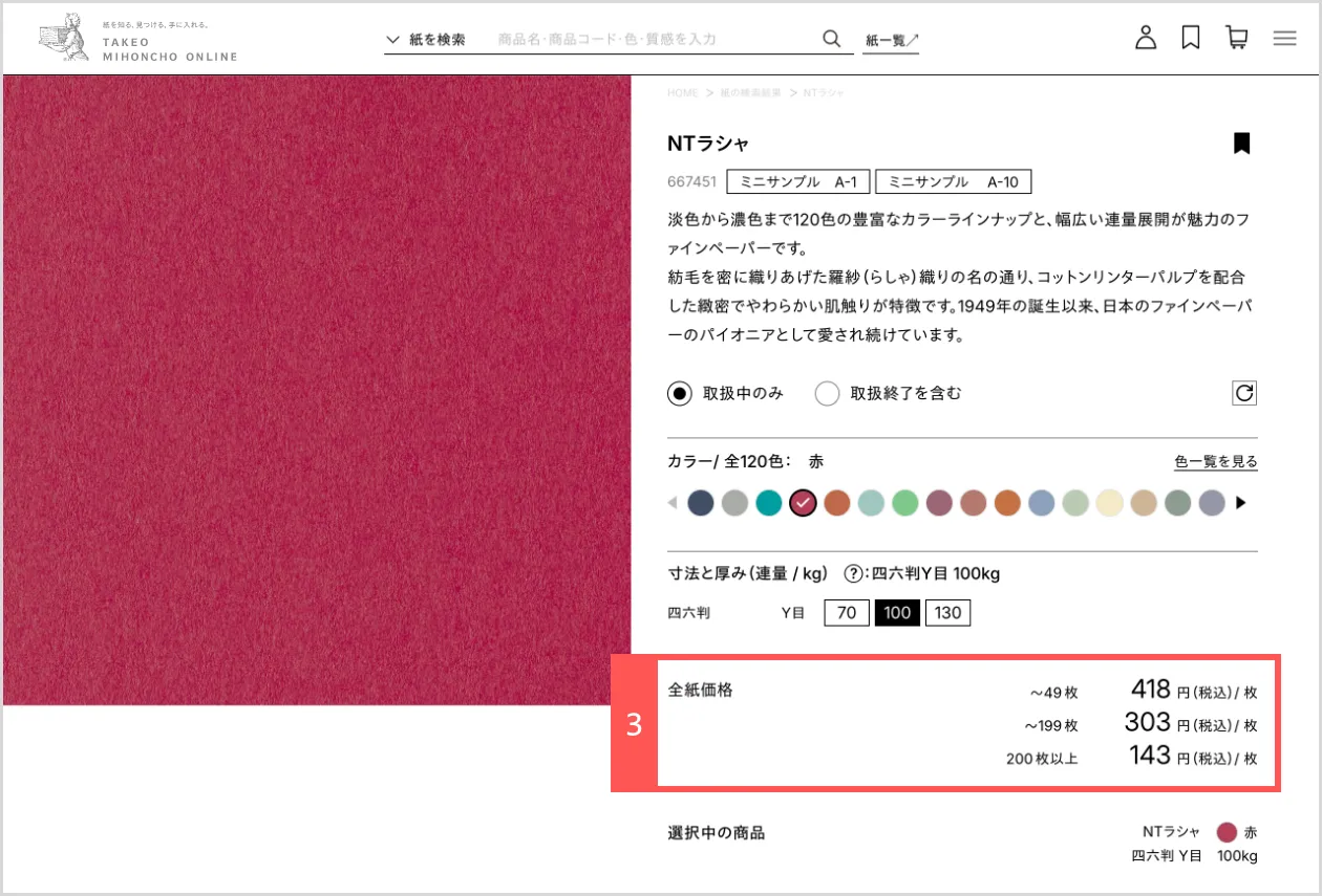寸法と連量を選択することで価格が表示されます。表示される価格は全紙で購入した際の1枚あたりの価格です。