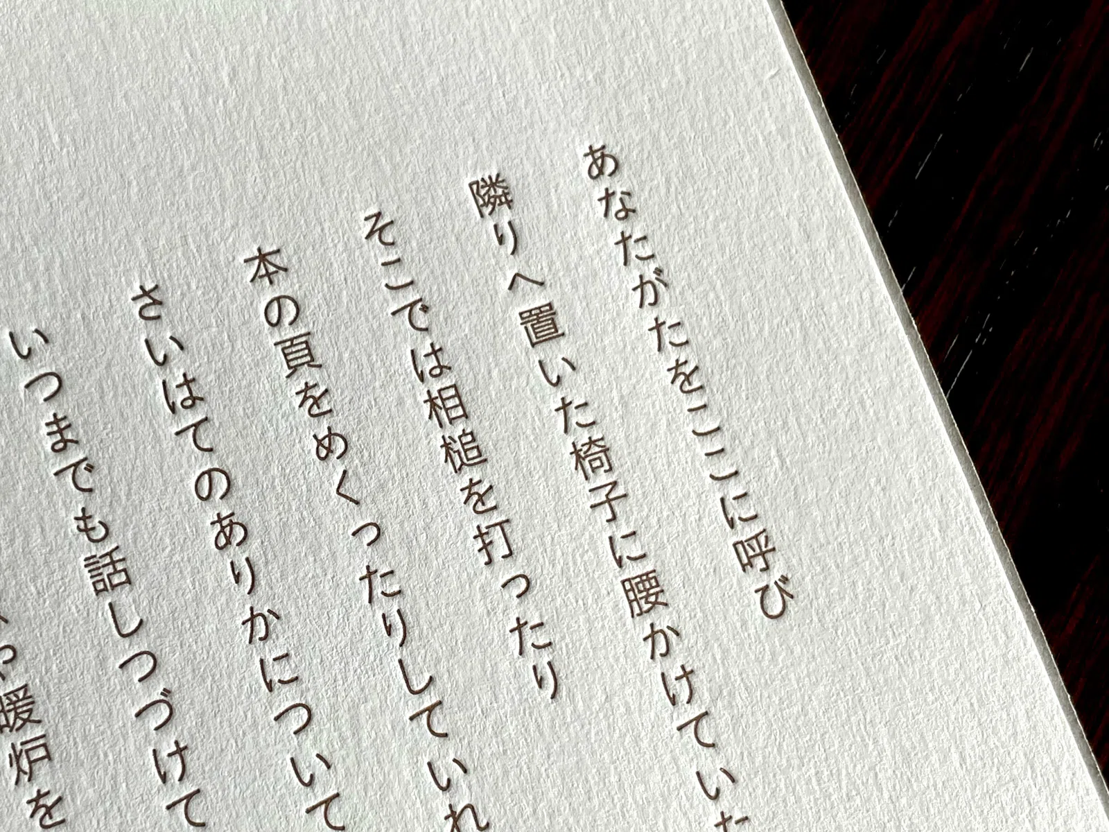 印圧によるへこみが美しく際立ち、紙が持つやさしい手触りと相まって、温もりのある印刷表現が得られます。