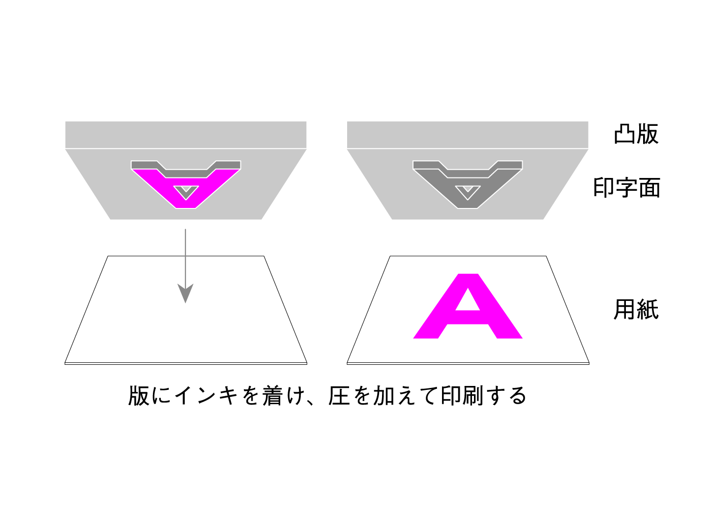 従来は活字と呼ばれる金属製の文字を組み、凸面にインキをのせて印刷しますが、亜鉛や樹脂で作られた凸版も用いられます。