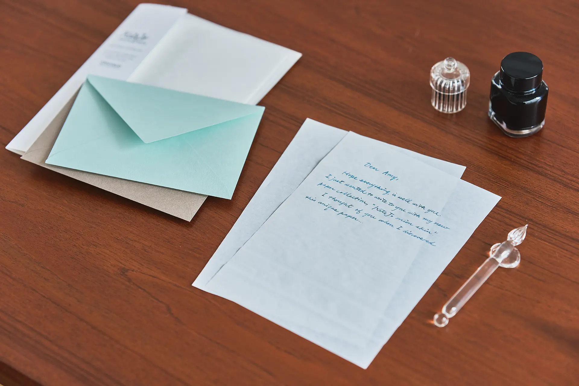 まるで玉ねぎの薄皮のように軽くやわらかく、しわ感のある紙、オニオンスキンペーパーを便箋にしました。