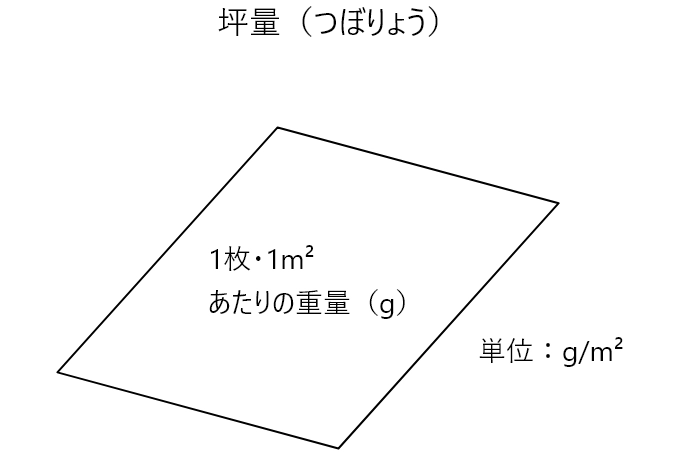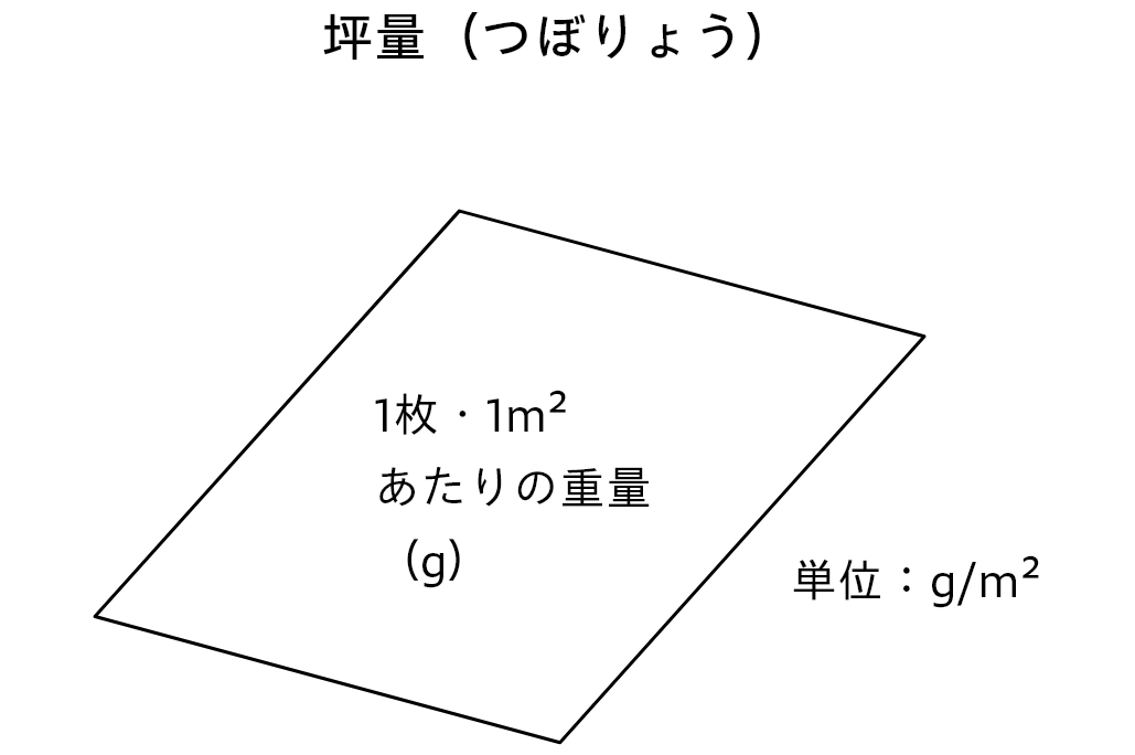 坪量とは洋紙、及び板紙1m²当たりの重量のことです。「g/m²」で表示します。坪量は紙の重さに関する元となる数値です。米坪(べいつぼ)、メートル坪量などと呼ぶこともあります。国際的には連量ではなく坪量で表すことが一般的です。