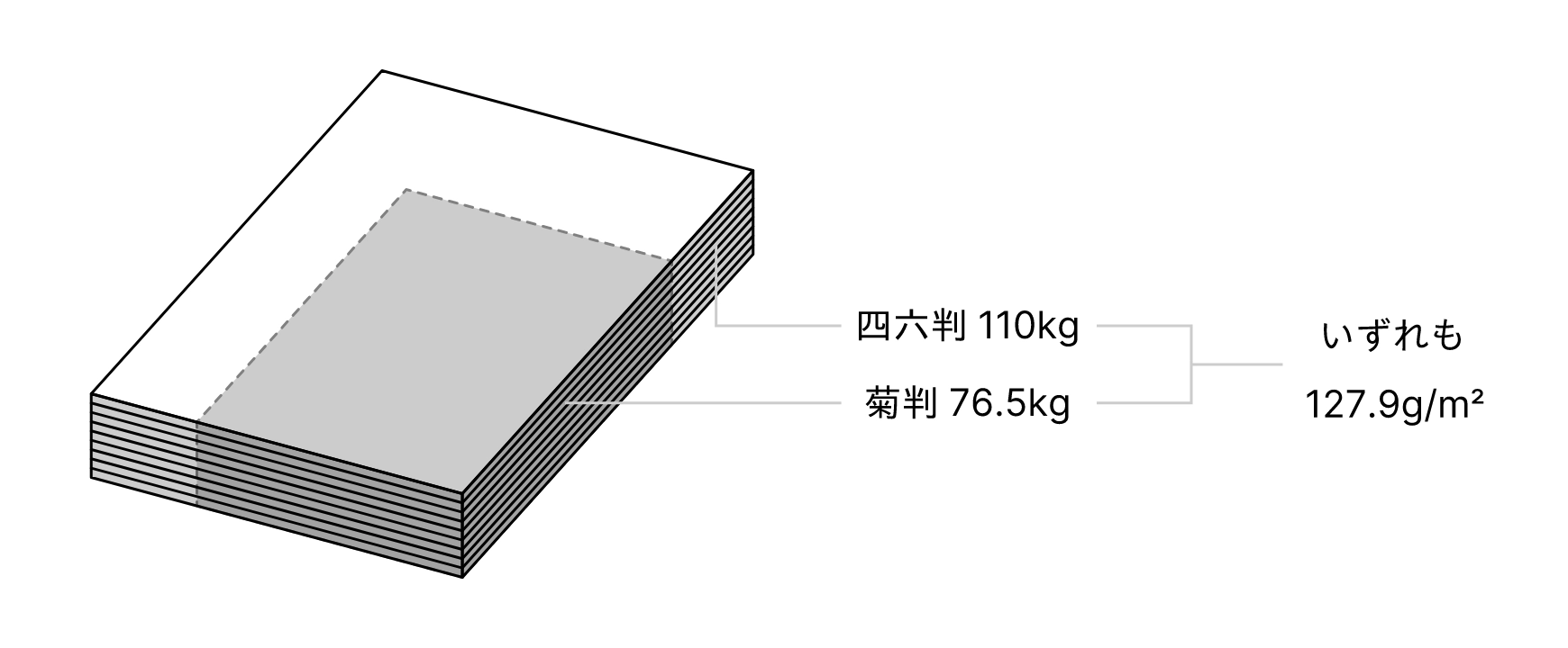※ 紙の連量を比較するときに、最も品数の多い四六判の連量表記にあわせることが多く、他の規格の連量を四六判ベースの連量に換算して比較することを四六判換算といいます。