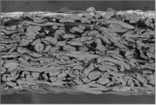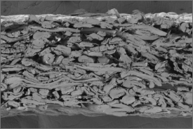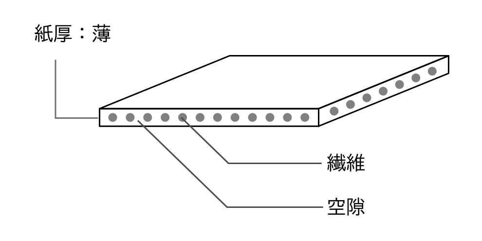 紙の密度は主に、パルプの叩解度によって変化します。叩解を進めれば進めるほど繊維間の結合が進み締まった紙になり、紙の平滑度も増します。反対に、叩解度を低くすると繊維間の空隙率(くうげきりつ)が高くなり密度の低い、空気を含んだ厚みのあるふわっとした紙になります。