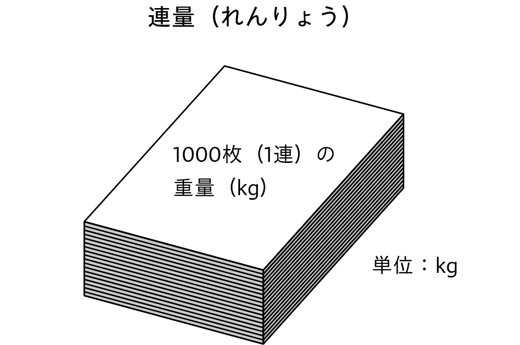 ある規定の寸法に仕上げられた紙1,000枚のことを1連(1R)と呼びます(板紙の場合、100枚で1ボード連・1BR)。連量とは1連の紙の重量のことをいい、単位はkgで表示します。連量は紙の厚みを知るための目安ともなります。