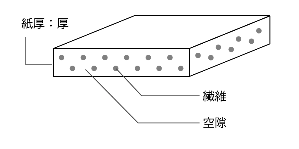 紙の厚さは坪量、連量だけでなくその紙の密度(緊度)によっても変わります。また、紙の密度は、平滑性、不透明度、光沢度、腰、強度、紙くせなどの品質特性にも影響します。