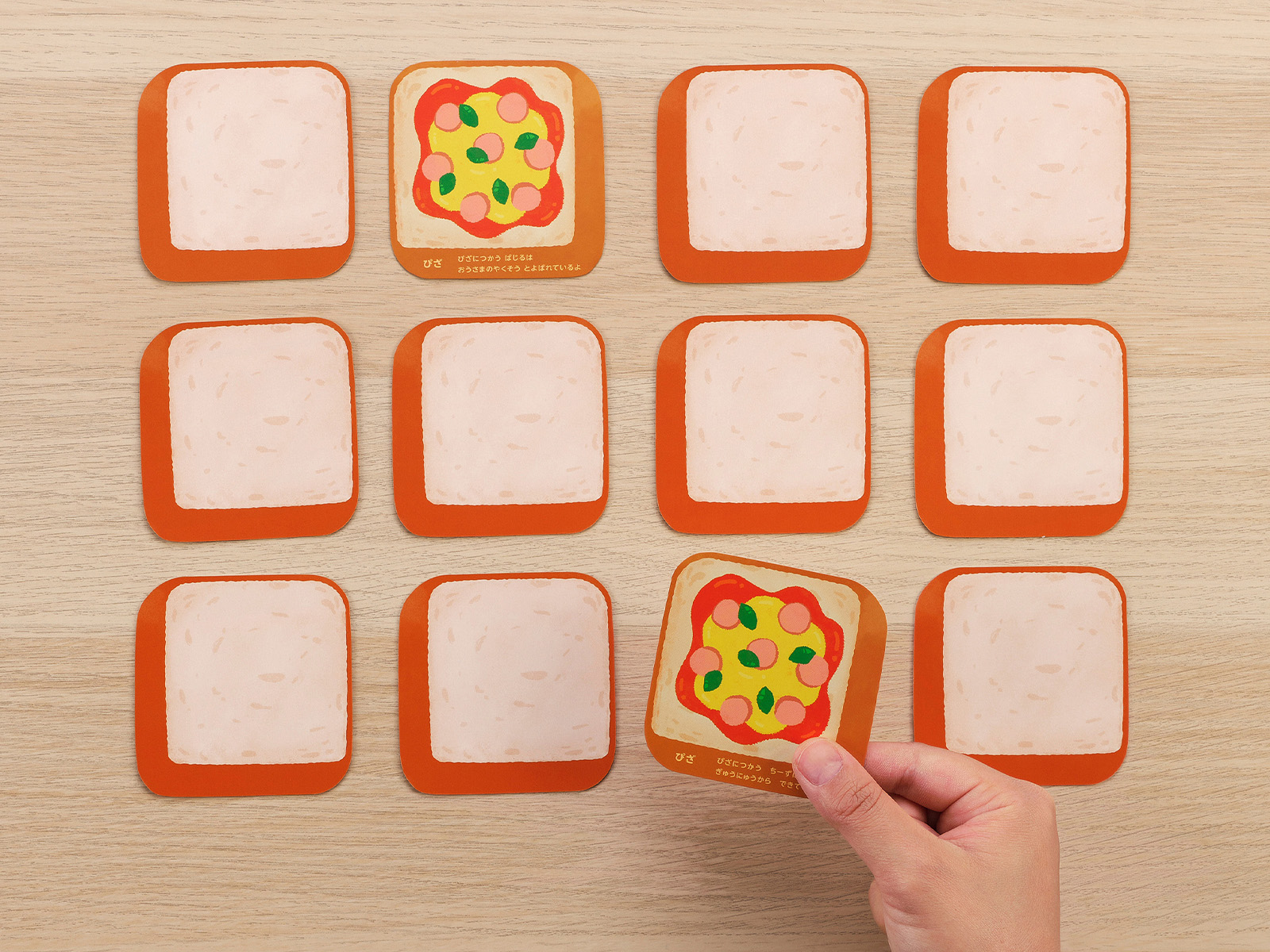 - おにぎりの具(あるいはぱんの具)で神経衰弱をしながら食育についても学ぶことができる、こども向け知育玩具のカード商品です。誰しもに馴染みのある食材がモチーフになっているので、その世界観に合う紙を選びたいと思いました。「テイクGAボード-FS」は触った時の手触りや優しい感触が相性が良いと感じ、パッケージの組箱に使用させていただきました。また、折り加工にも優れており組箱にした時の仕上がりがきれいなことも決め手でした。(銀鳥産業株式会社さん)