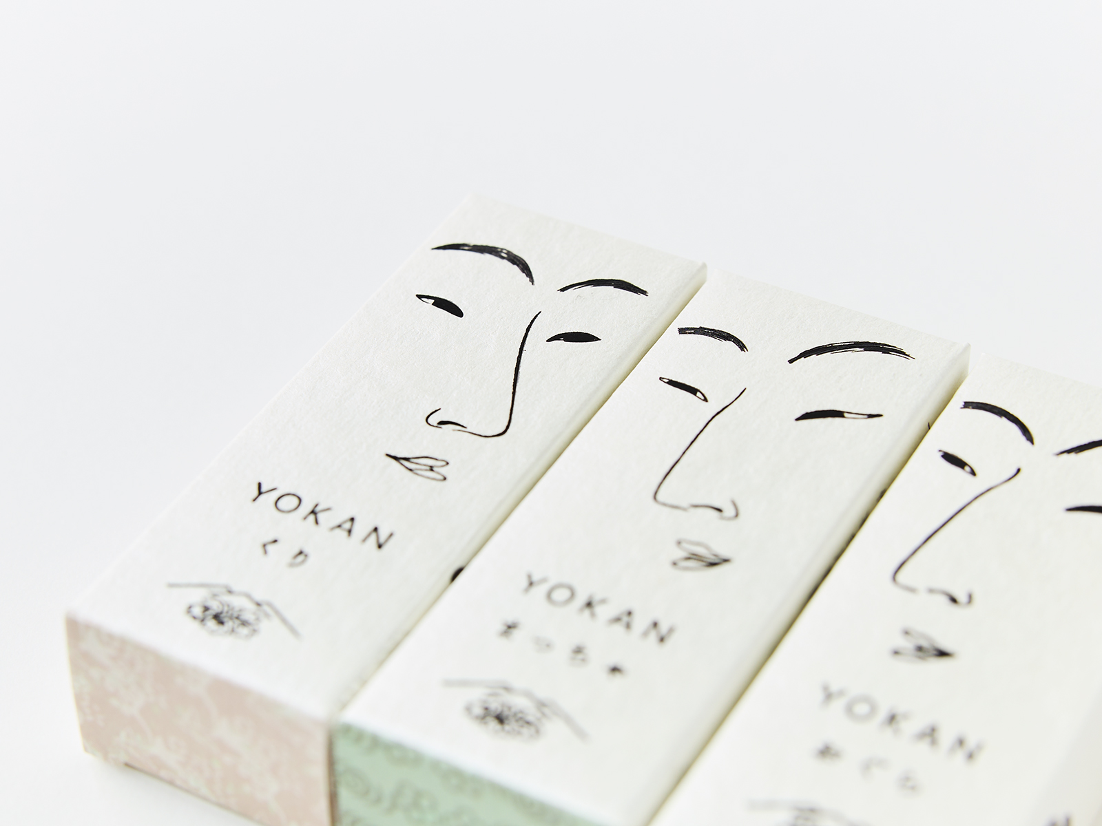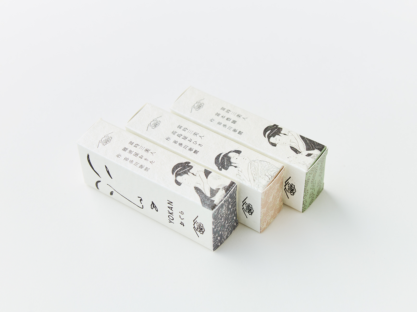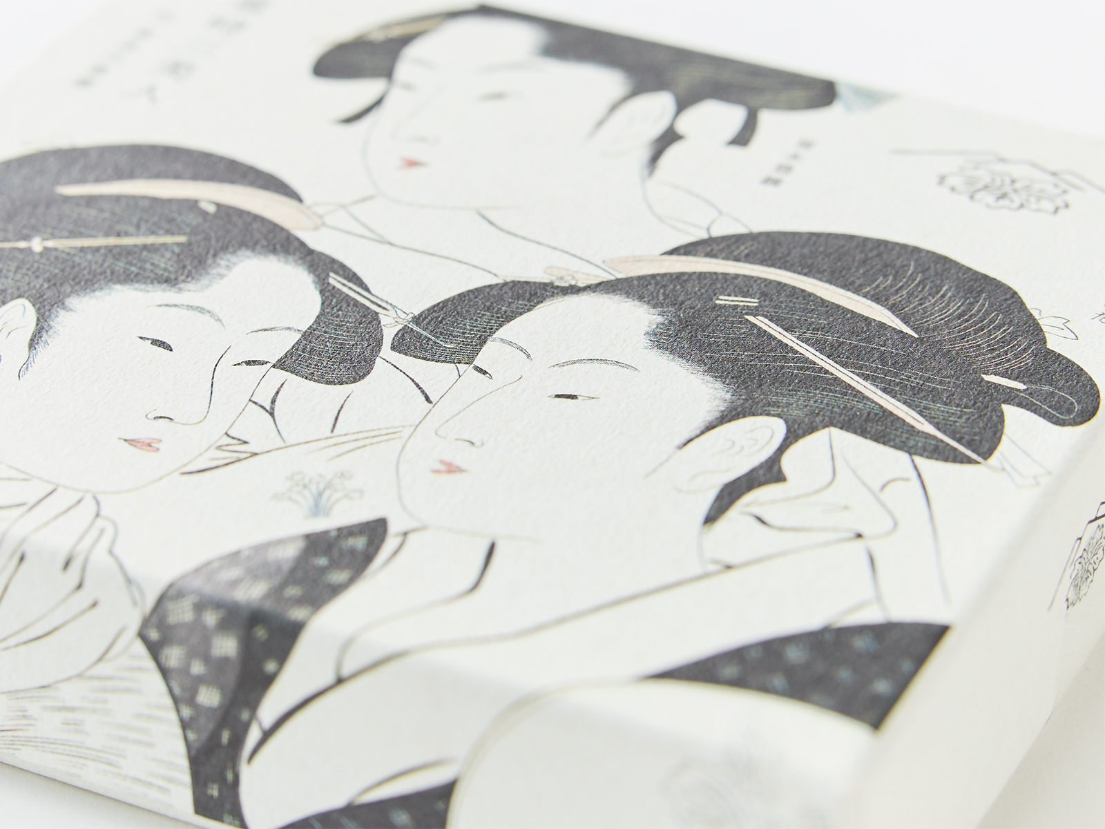 - カルチュア・コンビニエンス・クラブ株式会社と株式会社都松庵から発売された「當時三美人」羊羹セットのパッケージデザイン。美人画「當時三美人」の作者である喜多川歌麿について調べる中で、彼の人物画に背景として施されている、きらきらと光る技法、「雲母(キラ)引き」を知りました。雲母引きは、版元である蔦屋重三郎と喜多川歌麿が考案したと言われています。この技法は、美人画の品格と優雅さを際立たせるものであり、二人の革新的な美意識を象徴しているように感じました。そこで、印刷や加工による表現ではなく、紙自体が雲母引きのような風合いを持つものはないかを探したところ、まさに雲母引きをイメージして作られた「きらびき」という紙を発見。探していたイメージを体現しており、これ以外の選択肢は考えられませんでした。(サノワタルさん)