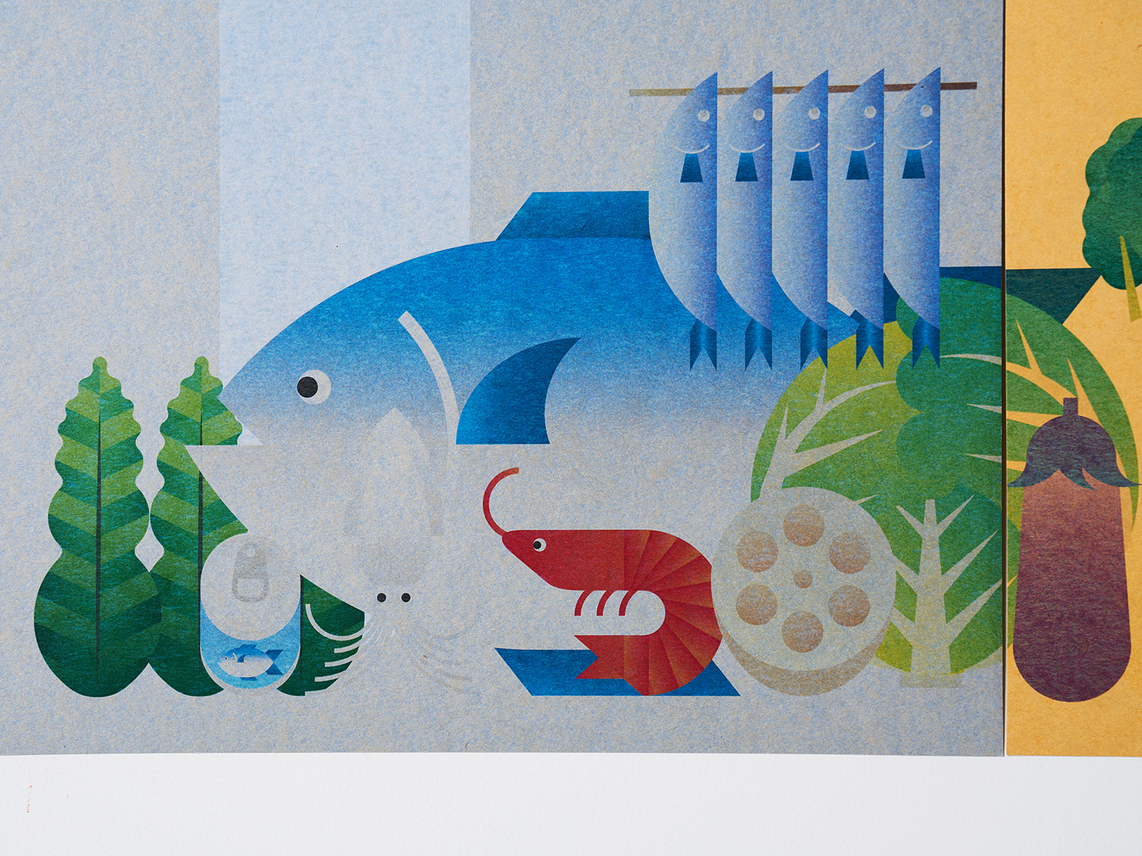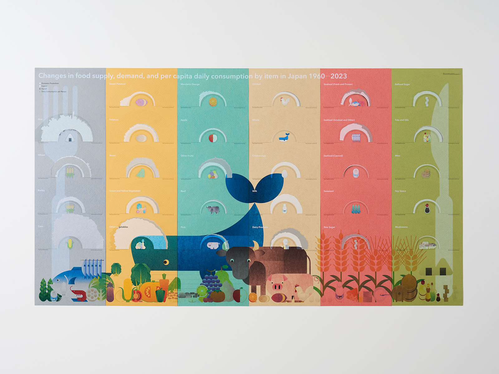 - 1960年から2023年までの米、小麦、牛肉、魚などの主要品目の国内生産量、輸入量、輸出量、国民1人・1日当たり供給粗食量をダイアグラムとして表現しました。イラストをメインとしながら、日本で生産され消費される食品群それぞれの推移を可視化することで、時代によって変化してきた食生活を見つめるきっかけとなれば嬉しいです。