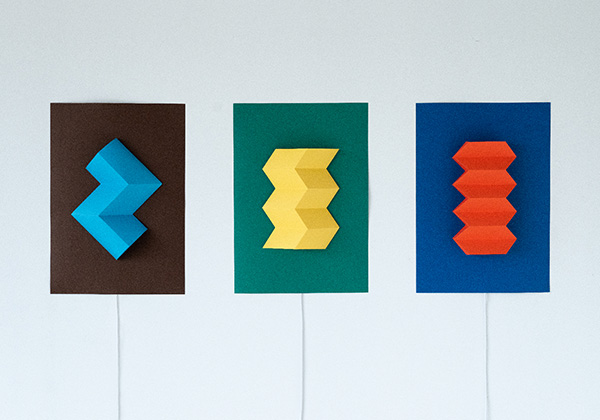 自分で組み立て、ポスターのように壁に貼る事の出来るライトです。消灯時は幾何学の立体が陰影を生み出し、点灯時はシェードに使用した「マーメイド」が優しく光を透過させます。壁に貼るポスター部分には「タント」と「ビオトープGA-FS」が採用されました。