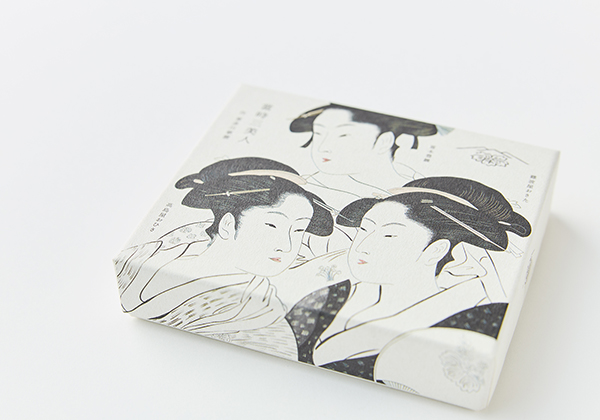 美人画「當時三美人」の作者である喜多川歌麿が、人物画の背景に用いた「雲母(キラ)引き」。組箱には、その技法をファインペーパーに用いた「きらびき-FS P」が採用されました。3本をまとめて収める貼箱には、素朴な風合いの「里紙」が使用されています。