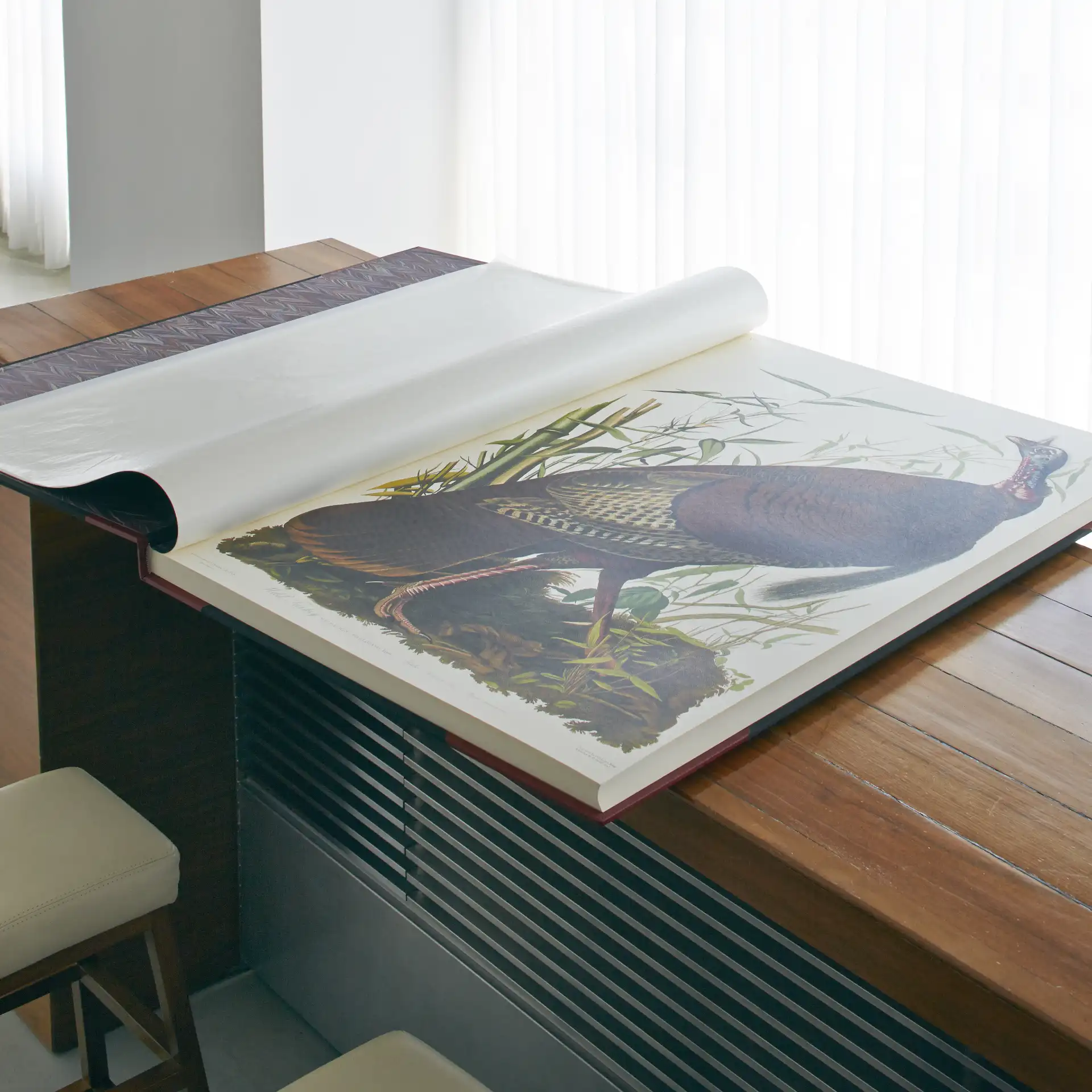 この本は雄松堂がずっとつくりたいと思っていた企画で、今回制作したのは、未製本版と製本版の2種類。明星大学所蔵のオリジナルを撮影しては色味を確認し、印刷データにしました。紙は当時のものになるべく近づけ、開きやすく、非塗工の紙、ということで竹尾さんといろいろな紙を検討した結果、特別に抄いてもらったのが「YUSHODO Audubon 2014」です。奇跡のようにいい紙に出会えたと思います。印刷は4色印刷。空気を多く含んでいる紙なので、インキがかなりしみ込みます。なので、これ以上盛れない、というギリギリのところまでインキを盛ったことで、美しい色が再現できました。実はもっとも苦労したのは丁合いなんです。大きいので置く場所がなくて、思いがけず時間も費用もかかりましたね。制作には約1年かかりました。書物を大切にしたい、長く残していきたいという思いをもつ方々との友情によってつくられたのだと感じています。