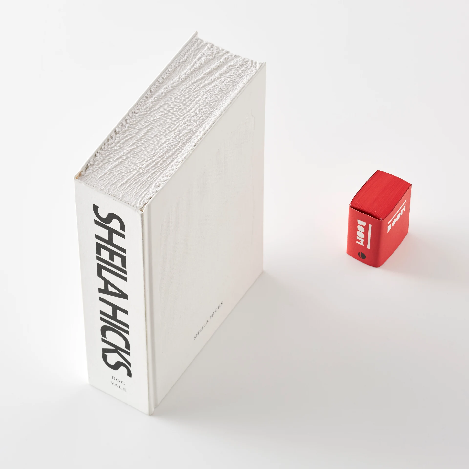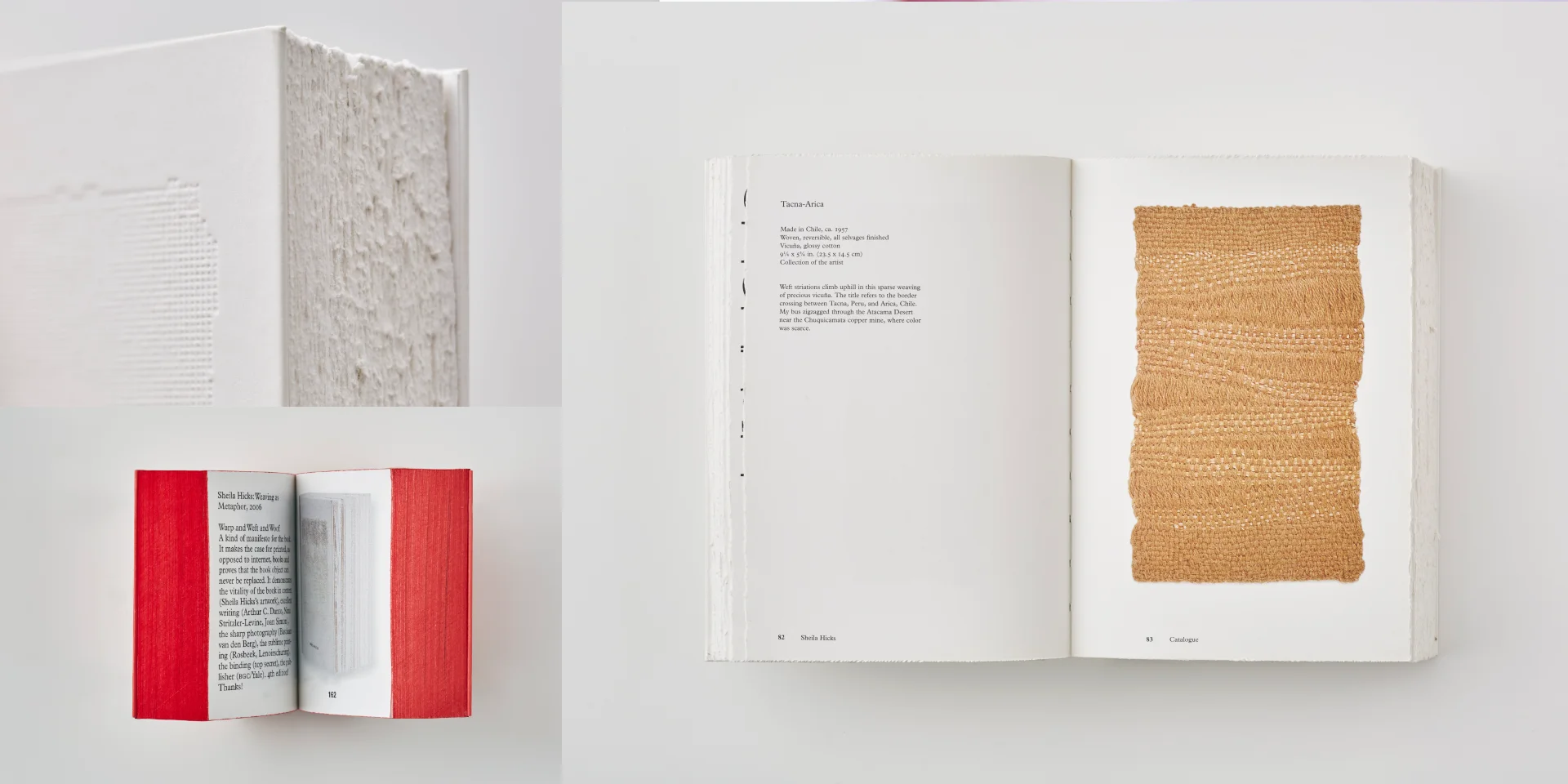 たとえば写真にあるシーラ・ヒックス(テキスタイルアーティスト)の本。この本の肝はもちろん小口ですが、最も重要な点は私が粗い小口が好きだからこうしたのではなく、この仕様が彼女の作品と韻を踏んでいるということです。「良い織物にはきれいな端が必要不可欠」と語った彼女の言葉がとても印象的だったので、作品集自体にもその特徴を生かすべきだと考えました。写真の赤い豆本は、私が初めて大きな個展を開いた際につくった私自身の作品集です。 私は制作の過程で作品を俯瞰して眺めるために、必ず自分の手で小さな模型をつくります。小さな本は大きな本よりずっと難しい技術を要しますが、せっかく自分のカタログをつくるなら私がいつもしているようにデザインしようと思い、このかたちに至りました。(続く)