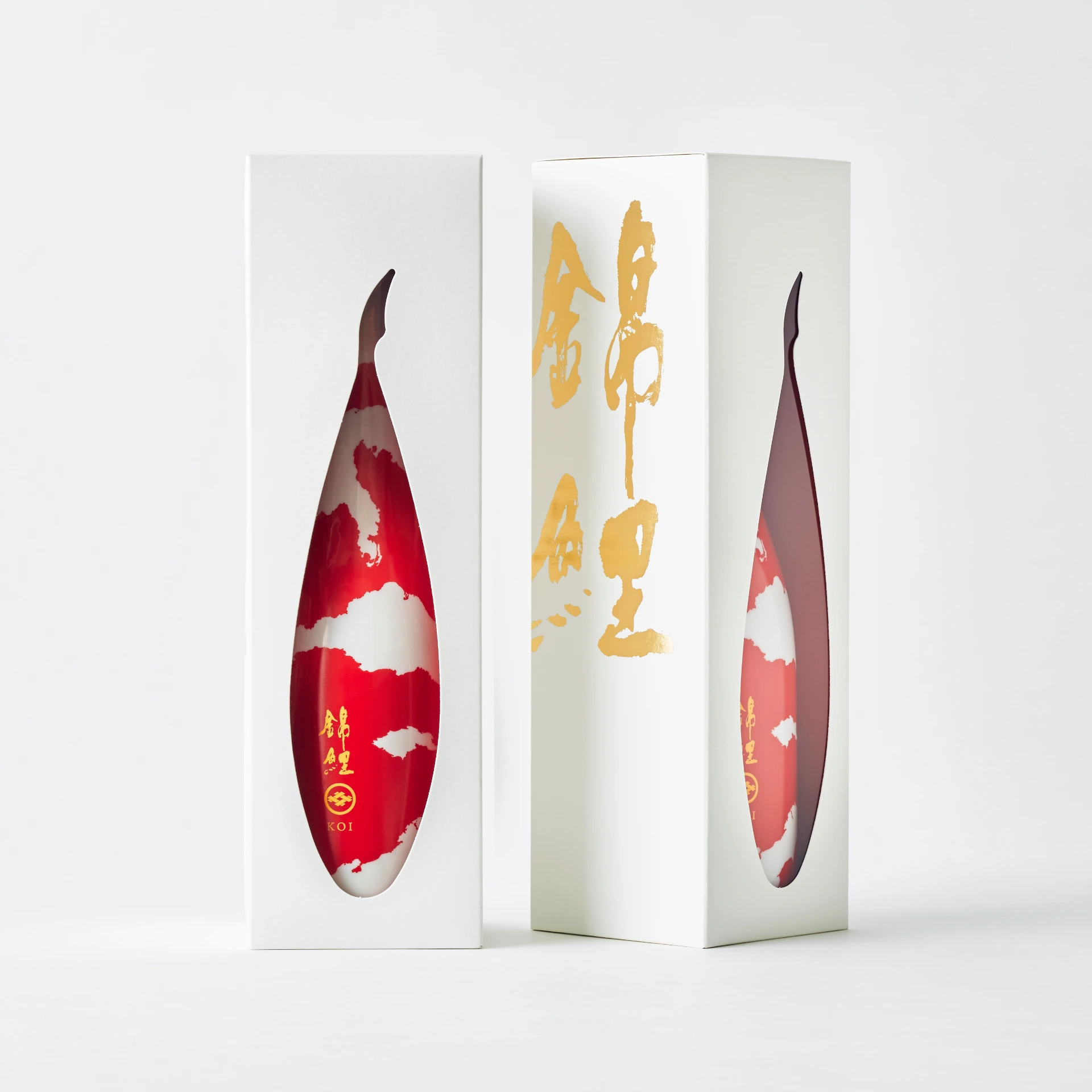 「今代司酒造はこの酒で世界に打って出る。小玉さんはこの酒のデザインで世界に名を轟かせてくれ」。始まりはそんな葉葺さんの熱い電話からでした。具体的な依頼は、錦鯉のデザインでハレの日に飲みたくなる日本酒をつくること。当初は錦鯉に鱗や目玉を付けてみたり、色をオレンジにしてみたりと、試作を無数に繰り返しました。最終的に模様を抽象的にしたのは、本物の鯉ではなく今代司酒造の精神を象徴する表現にしたいと考えたからです。また、当初は瓶単体のデザインを想定していましたが、箱に入れて窓を開けるデザインの方がより魚らしく見えることに気がつき、私から提案しました。