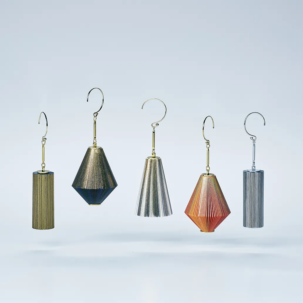 三方金の煌びやかさと、紙の軽やかさ。各々の素材が携える固有の特長を融合させたのがikueです。プロジェクトの発端は日本の優れたものづくり技術を活かした新規事業を提案するコンペティションへの参加。無限にある可能性を暗中模索していく中で紙のジュエリーという形に行き着いたのは、古来より聖書などを彩ってきた三方金の伝統を未来に繋げたいと思ったこと、そして本来は金属製であるプロダクトが紙製になるという発想の飛躍が驚きをもたらすはずだと考えたからです。輸送のしやすさや付加価値の高さなどビジネス面での優位性も熟慮しました。使用した紙は、ジュエリーとして金属にも引けを取らない華やかさを体現できる多彩な色と豊かな質感を兼ね備えたサガンGAとジェラードGAとタント。 身に付けた時に紙が主役として映えるよう、金具はできる限り存在感を消す作りに徹しています。開発過程では篠原紙工さんが業界の枠を超えるアイデア、想定以上の精度を次々と実現してくださり、紙に対する感覚が一変しました。商品化に先んじて出展したメゾン・エ・オブジェでも「これが紙なの?」「軽い!」という声が寄せられました。ikueがジュエリー売場に並んだ際、紙好きの方々は勿論、普段あまり紙に馴染みのない人たちにも自然と手に取ってもらえるような、紙の価値観を更新するプロダクトとして世の中に広まっていけば幸いです。