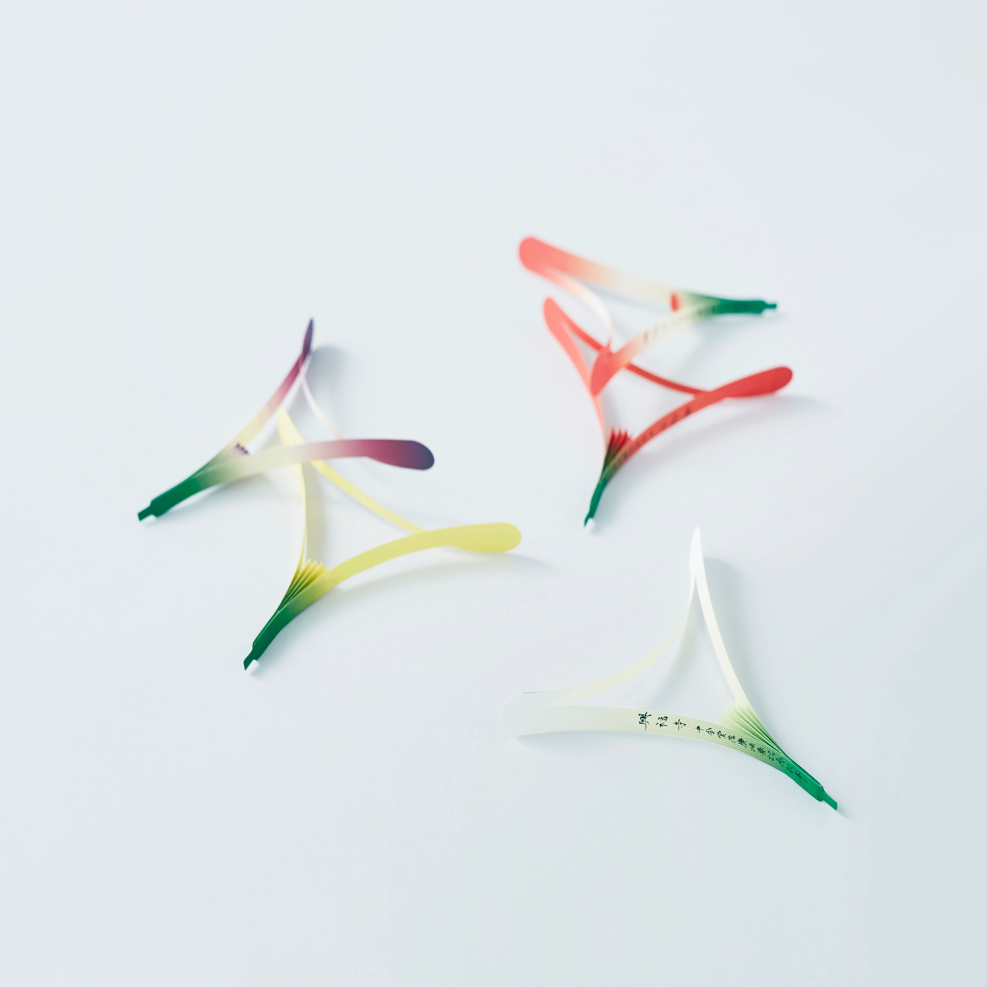 初めて散華を見たときの光景が「まわり花」の発想の源です。無数の紙が一瞬の間だけ空中を舞い、地面に降り立った瞬間に消えてしまう。そんな儚さに魅了され、その舞いざまを美しく研ぎ澄ましてみたいと思いました。平面の紙である散華を立体的にしてみたのは、ありがたさやめでたさを、生き生きとした「体験」として感じてもらうため。物というより空間をつくる感覚です。空中を回転することで円錐状の残像が発生し、花の姿が現れるのが「まわり花」の仕組みですが、タンポポのように風にのって移動する種子をたくさん集めて飛び方の参考にしながら、長さや厚みなどをミリ単位で検証し、地道に試作を重ねていきました。誰でも簡単に組み立てられるように、一枚の紙のパーツを手順通りに折り畳むだけで完成する構造になっています。紙にタントを選んだのは、華美すぎない素朴さがあり、屋外の環境に耐えられる張りをもっているからです。色は秋空に調和し、空中で色同士が喧嘩しないよう配慮しました。製造の過程で苦労したのが抜き加工です。位置がずれると色が分断され、強度や飛び方も変わってしまうため、その精度は生命線でしたが、岡村印刷工業さんの精緻な仕事に助けていただきました。実験的に始まった「まわり花」は、2018年10月、興福寺中金堂落慶法要のための散華として散布されました。大舞台でお披露目されたことは得がたい体験でしたが、このプロジェクトは始動したばかり。糊を使わずにつくれる構造や大きなサイズなど、さまざまに構想を膨らませて、これからも紙の飛行のデザインの可能性を探っていくつもりです。