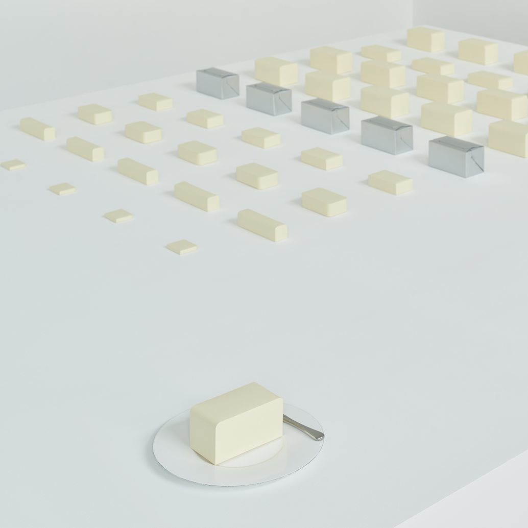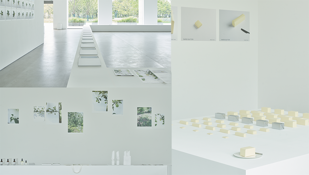 ロの字の台で、真ん中を空けて、「もののあいだにある空気感を表現したい」と。