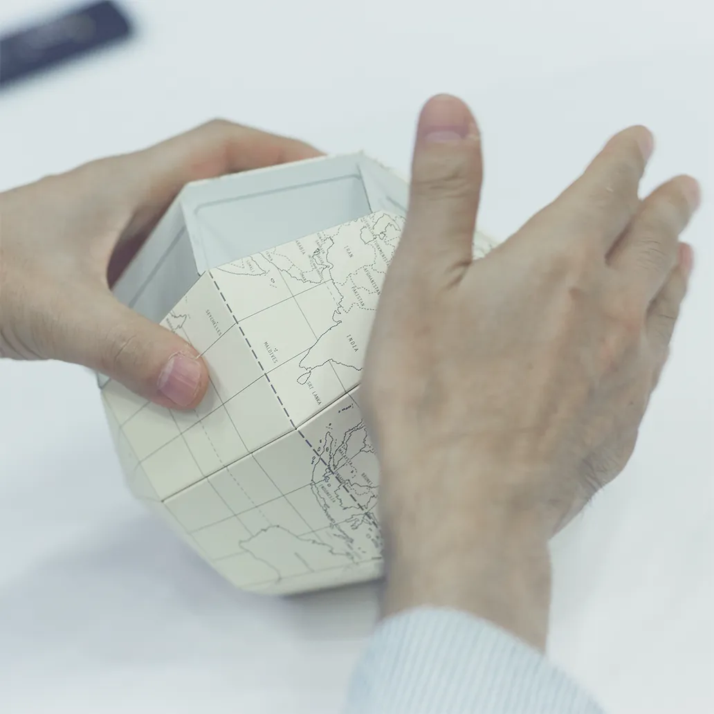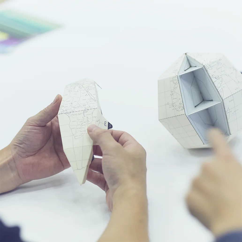 - 既存の価値観が揺らぐことで、それまで見えなかったことに気づけるようになりますよね。グラフィックのデザイナーをやっていると、どうしても完成品としての紙のことだけを考えがちですが、その手前には製紙工場があって、木材があって、森がある。そこまで視野を広げると、紙を使う以前のステップに対しても何かアクションできるんじゃないかと思うことがあります。私たちが「geografia」という地球儀をつくったときにも、「地球って丸いんだ」ということに改めて気がつきました。天気図のような平面地図ではどうしても地域が分断されがちですが、丸い地球儀で見るとアマゾンや北極がひとつながりにあることが実感しやすくなる。分かっているようで感じられていないことが実はまだたくさんあるのに、デザイナーって意外と視野が狭くなっていたりします。竹村さんとお話しているとそういう部分の窓がパカパカと開いていく感覚があるんです。