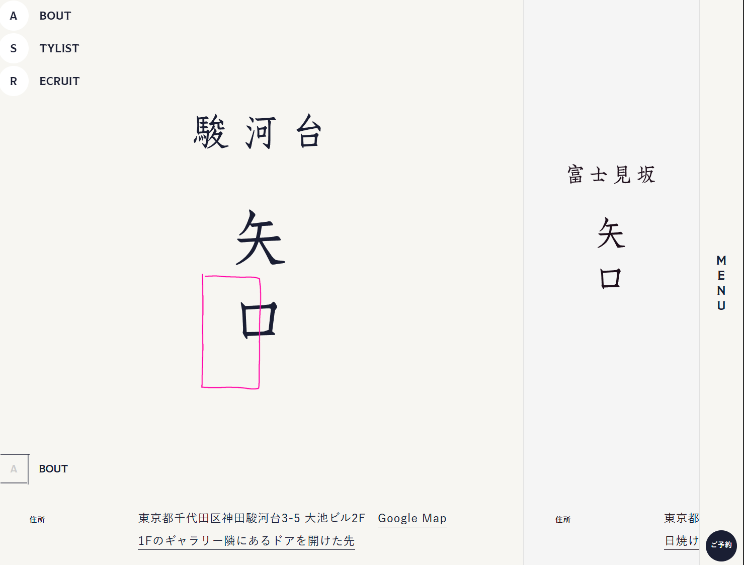 - 田中さんに作ってもらった「駿河台 矢口(web design: 有本誠司 | Semitransparent Design)」という美容院のウェブサイトもそうでしたね。大げさなモデルの写真はいっさいないシンプルな構成。カーソルがヘンテコな手書きの長方形になっていて、実はそれはお店のドアの形だという、まったく美容院らしくないサイトで。