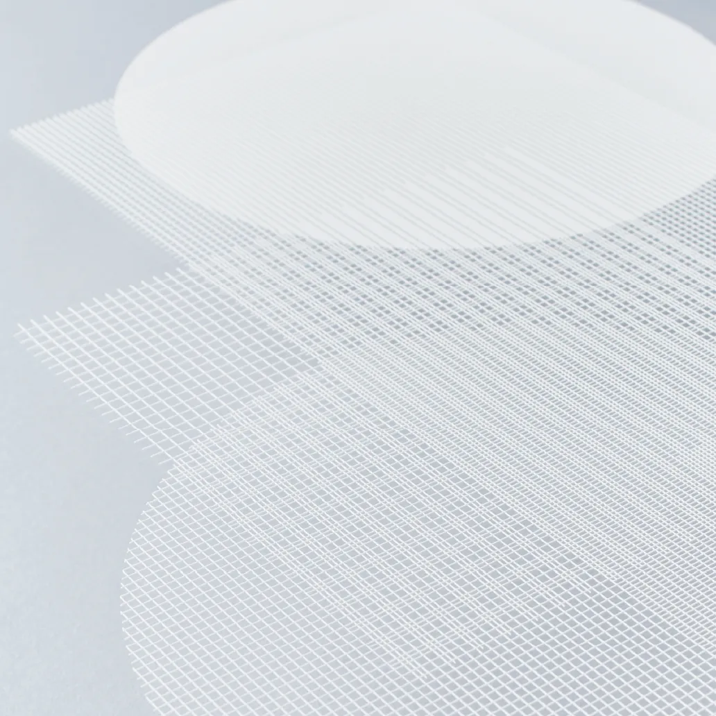 レーザー光の照射で紙を抜くレーザーカットは、カッティングプロッターや金型を使用する抜き加工では難しい超微細な形を正確にカットできる技術。0.4mmの罫線からなる極細の格子が間断なく連なった紙は、まるで空気が形を成したかのような透明感を携えながら、触れると指先に無数の豊かな触感が伝わります。