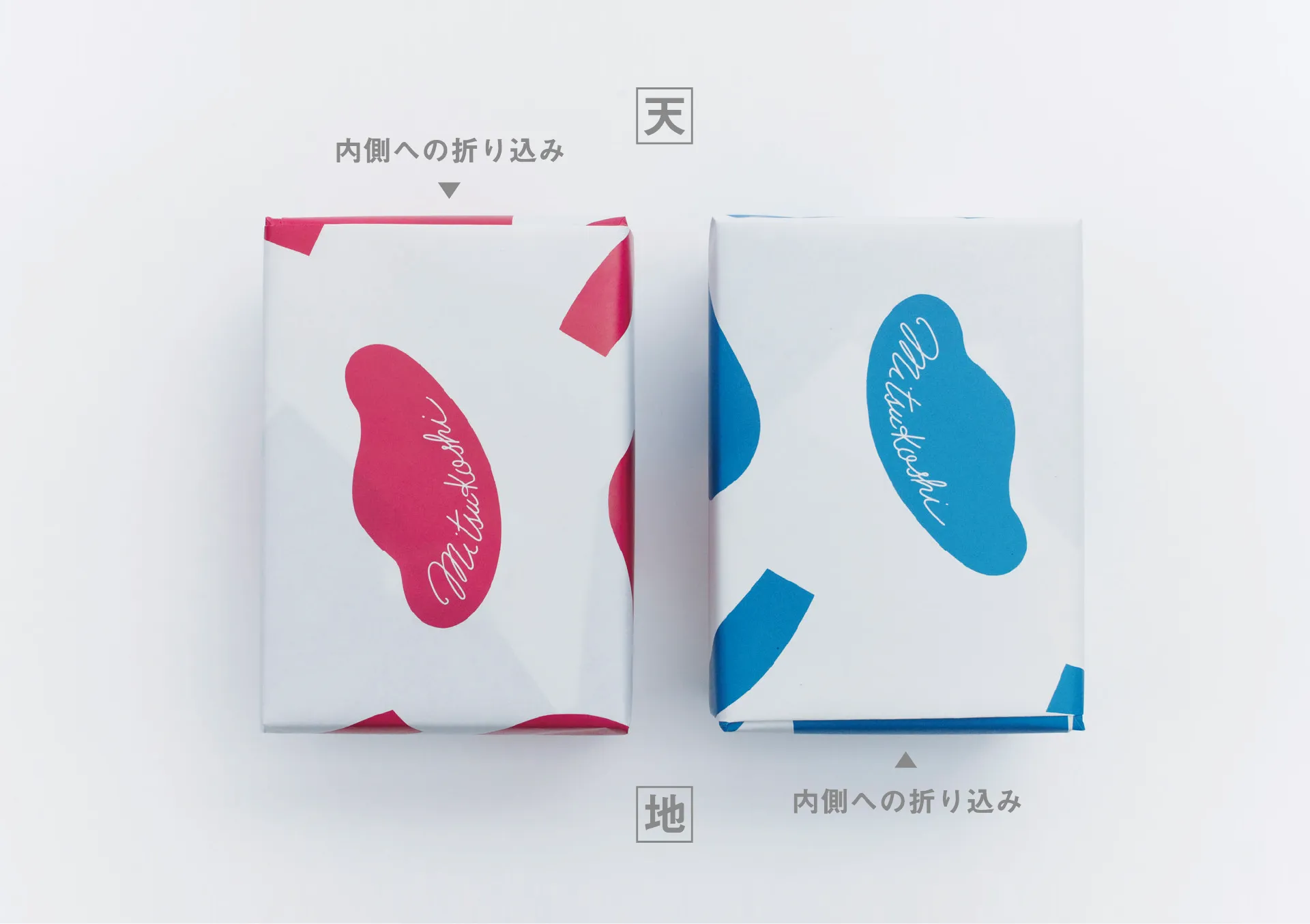 「斜め包み」は、祝儀と不祝儀で折り方が違います。祝儀は箱の「天」の位置に内側への折り目が重なります。そこには「幸せが上から入り、下から出ていかないように」という意味があるそうです。不祝儀は「地」の位置に内側への折り目が重なるようになっています。「不幸が下から落ちるように」との意味からだそうです。細やかな所まで気配りをする、日本人ならではの作法です。
