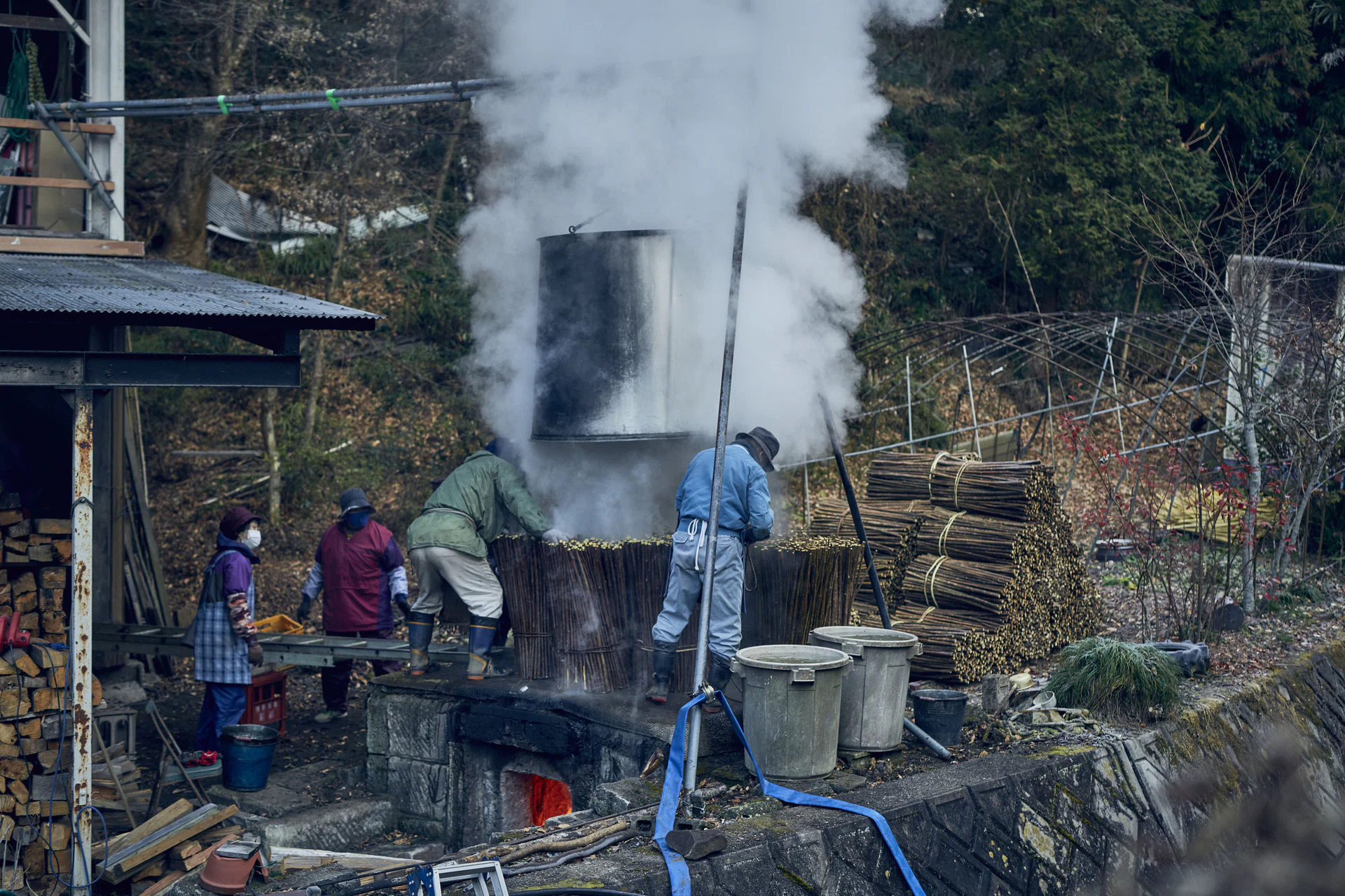 楮蒸しは、 収穫した楮を蒸気で柔らかくする工程。