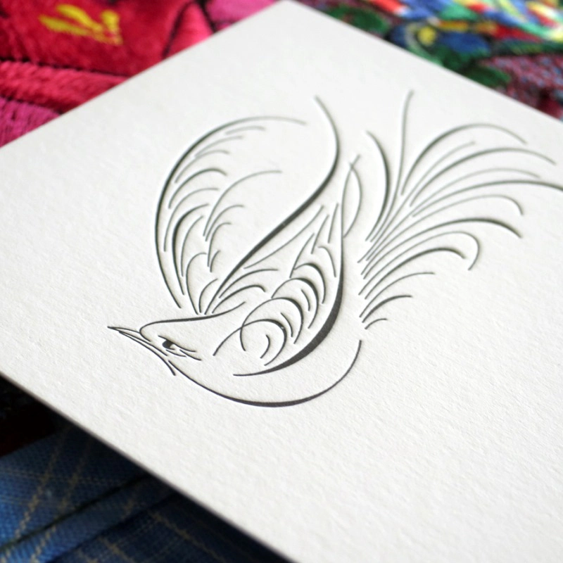 より洗練された印象の活版印刷を表現する為に「スノーブル‐FS」を選びました。厚すぎず、薄すぎず、ほどよい硬質さを持った真っ白な「スノーブル‐FS」に、文字と線画で構成されたデザインはとても相性が良く、ディープレリーフ樹脂凸版特有の深いへこみが綺麗に出ることにより、新年のご挨拶にふさわしい凛とした印象に仕上がっています。(Bird Design Letterpress 市倉郁倫さん)