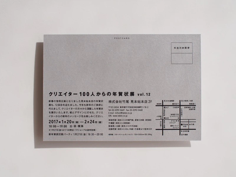 見本帖本店で開催される「クリエイター100人からの年賀状」展vol.12のDMをご紹介します。