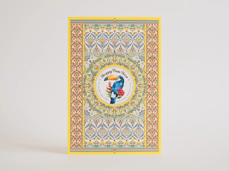 細密なアラベスク模様と手描きイラストの両方を活かすため、温かな風合いがありつつ発色のいい「ヴァンヌーボV」を選びました。鮮やかな多色使いが紙表面の凹凸と相まって、陽気な仕上がりになりました。(株式会社tote 谷井さん)
