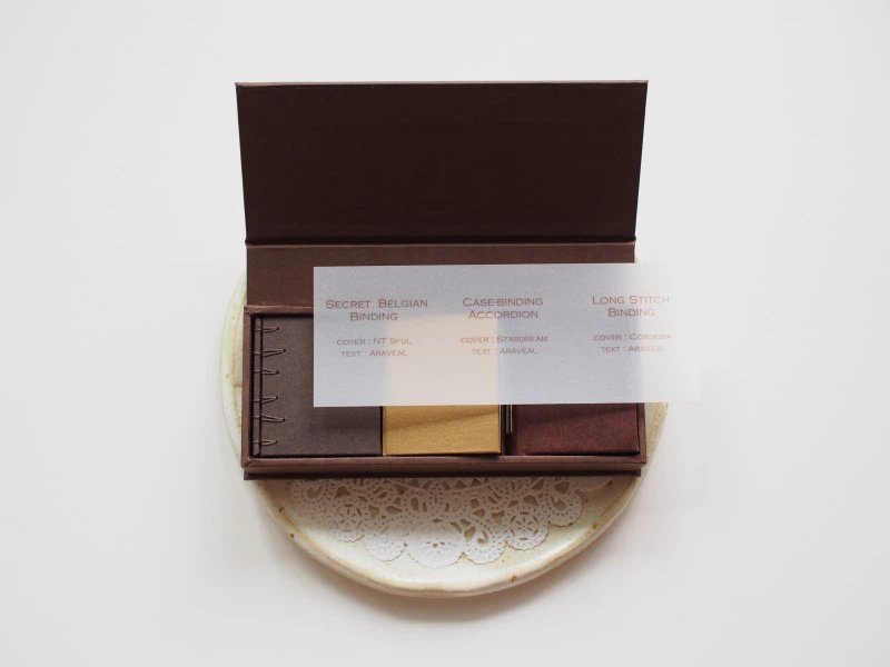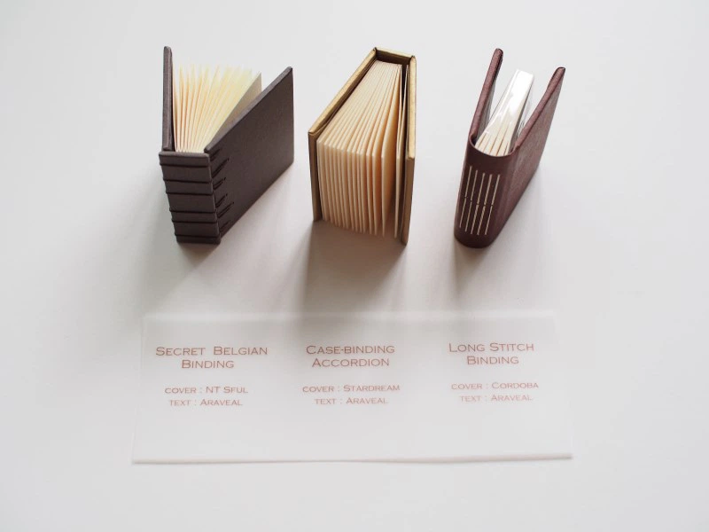 本文には柔らかい色合いのアラベールを使用。3種類の製本法で綴じています。