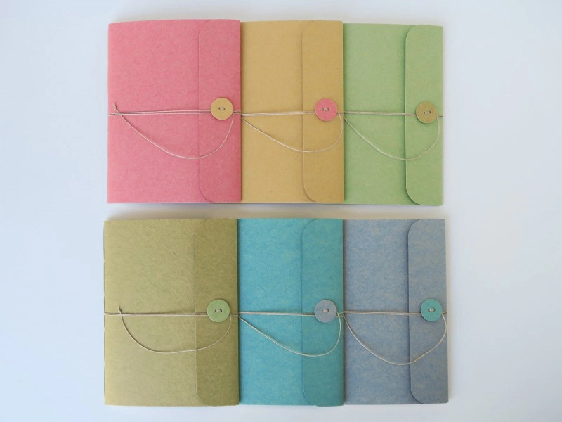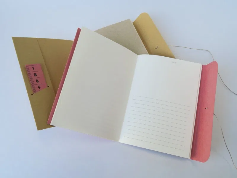 旅ノートの見開きには小さな栞が3枚。定規と旅に役立つ小さなスケール表です。初めと終わりのページにはチケットなどが挟めるポケットを付けました。表紙の色ごとに綴じ糸も変わります。留めボタンは、2色のファーストヴィンテージを合紙して作りました。本文は片面の罫線入り。文字数に関係なく、たくさん書き込めるデザインになっています。(KaoPoK Bookbinding 原田 薫さん)