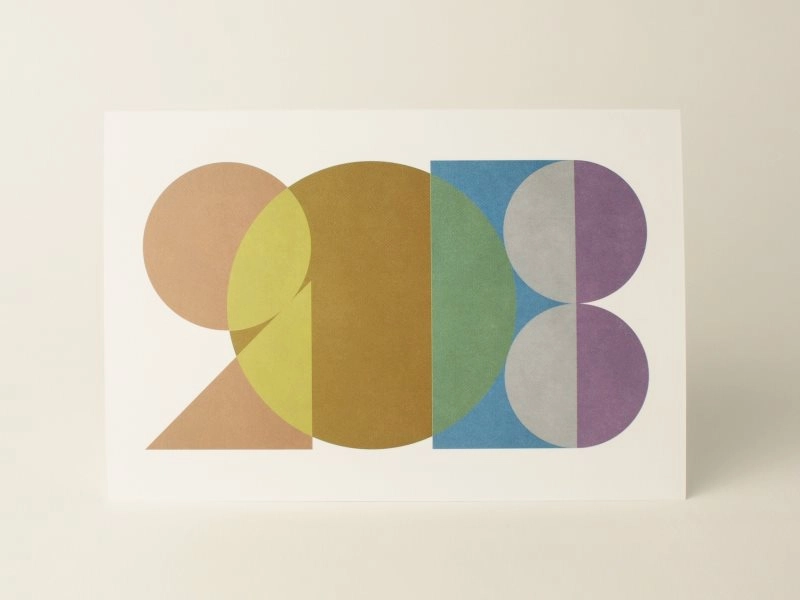 デザインは、年号である「2018」を落ち着いた上品な色合いのタイポグラフィで表現しています。通常、シルバーインキには色を重ね刷りすることは難しいのですが、特殊なシルバーインキを用いてシルバーにプロセス3Cを重ねることで、多様なメタリックカラーを表現しています。またメタリック感を強調し、汚れ防止のために絵柄面の印刷部分のみ超光沢ニスを重ねています。(株式会社竹尾 企画部)