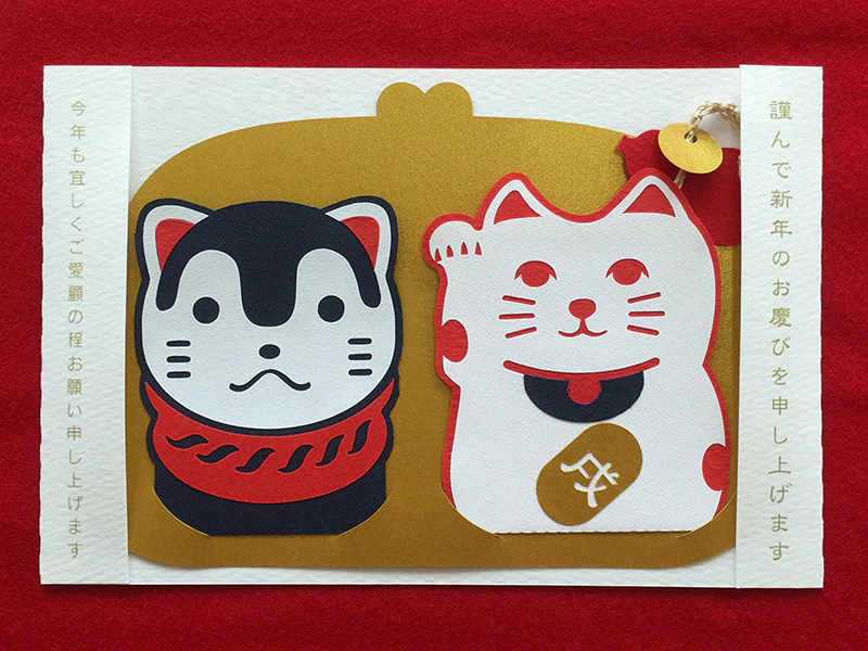 表面の凹凸感や色が和雑貨にとても合うと思いました。台紙は金紙のガマ口財布に瓢箪の根付けを付けて賑やかに。福をテーマにした伝統的な狛犬と招き猫のぽち袋は、赤、あい、白の3色カラーで、可愛らしくポップに表現しました。(ソロルファクトリー サトウナオコさん)