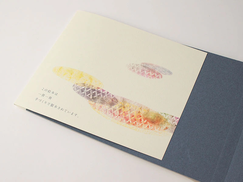 頁をめくる感触も物語への入り口と考え、肌触りの良さを一番に、アラベールを選びました。沙羅さんが和紙に木版刷りした風合いをそのままスキャニングしているため、印刷されると不思議な印象になりました。この本の製本は二つ折りの折り山を背固めし、小口に糊で貼る方法で作っているため、ふんわりしているアラベールが製本上でも良い効果を発揮してくれます。(美篶堂/本づくり協会 上島明子さん)