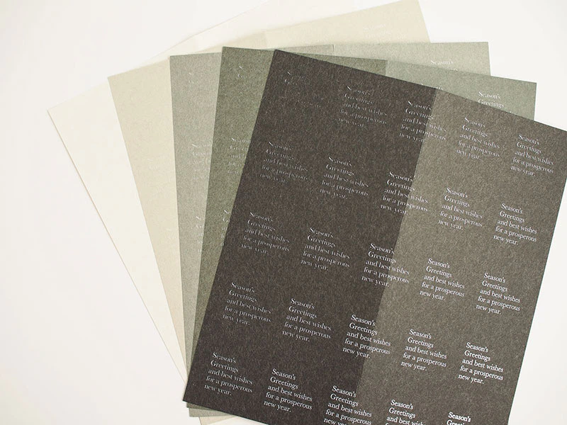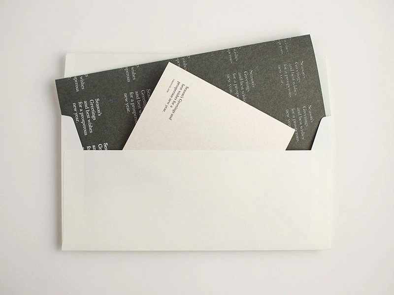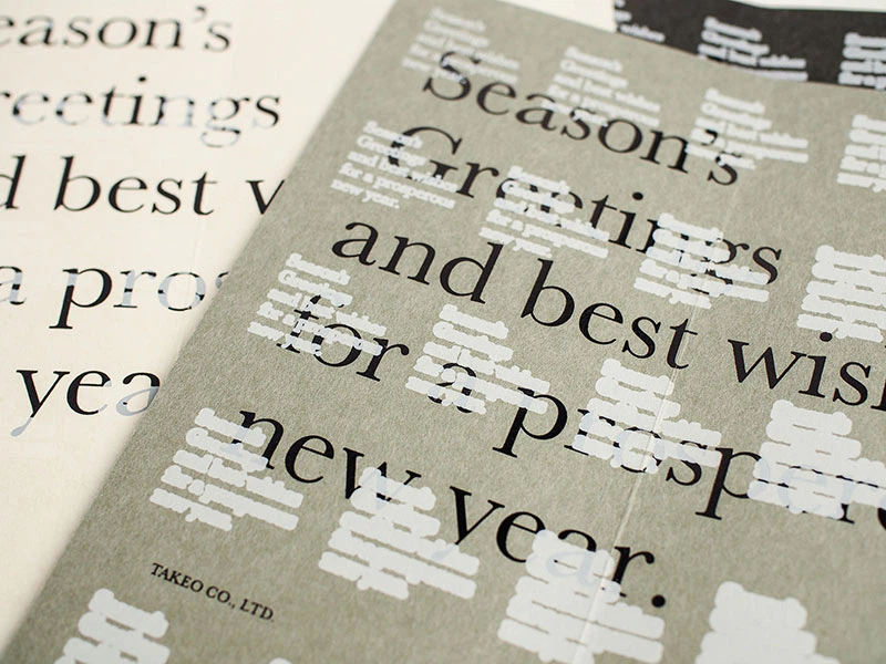 時間が経過する様子を、季節の挨拶文に雪が降り積もるようなイメージを文字の太さのグラデーションで段階的に見せることで表現し、中面では黒箔の上にUVオフセットの白を乗せる試みを行いました。里紙は、日本の風土と自然に調和した素朴な味わいがあるファインペーパーです。自然の温もりとやさしさを感じさせる里紙を海外のお客様にも届けたいという想いで選定しました。(株式会社竹尾 企画部)
