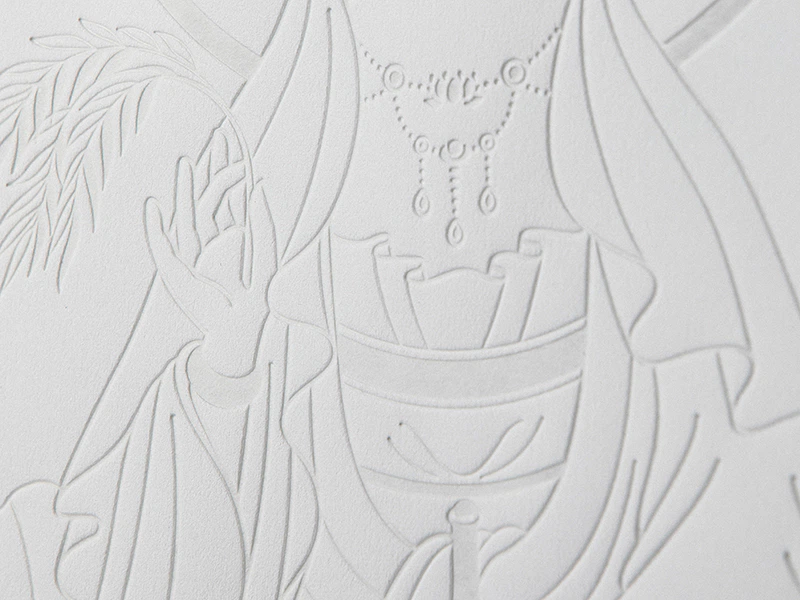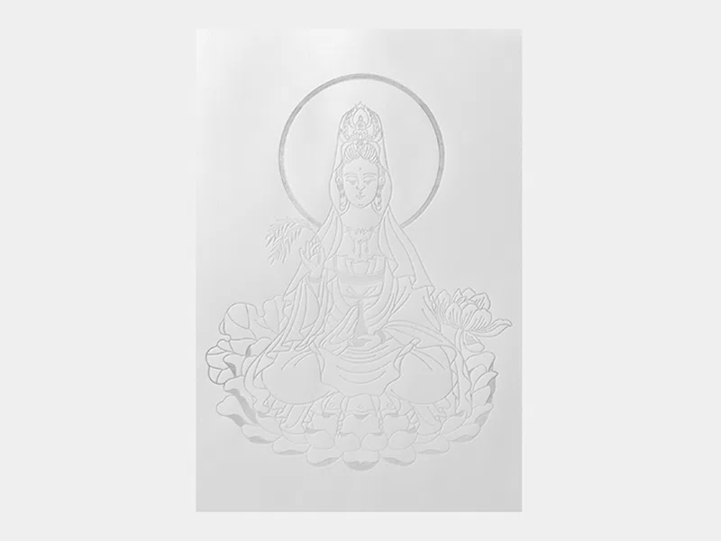 燙透紙加工過後會剩下中間透光的膜,覺得這樣的氣質很適合觀世音菩薩呈現。就像是菩薩發光的樣子,低調且高雅。