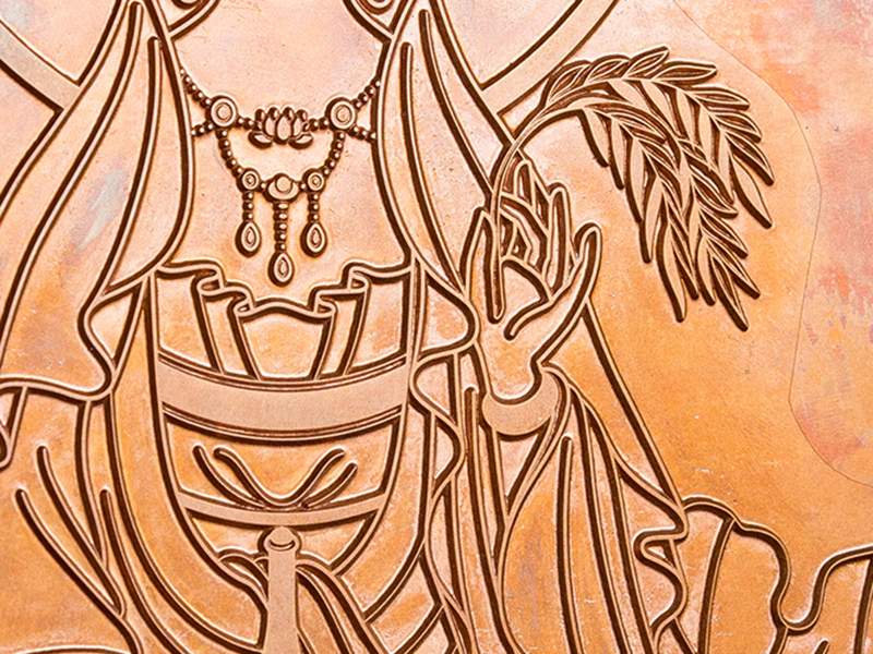 パチカの加熱型押し後に残った薄い膜になった部分が光を透過する様が、観世音菩薩が現れて慎み深く高尚に光り輝いている様子にとてもあっていてるように感じ、選びました。(田修銓さん)