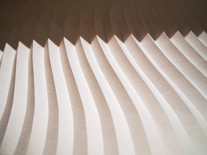 アンダーズ 東京のデザイナーであるトニー・チーが掲げた「Memory-”折り紙”のように折り重なっていく記憶」というコンセプトにインスピレーションを得て「折り紙」をテーマとし、「折りひだ」で記憶の重なりを表現するとともに陰影を生み出しつつ、クリスマスという神聖な日を祝す木を模した造形に表現しました。今回は、クリスマスということで「雪」をテーマに雪に関する銘柄を選び製作し、紙の開発者の雪への思いを一層一層変化を加えて表現しました。(西村優子さん)