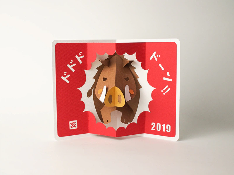 今年の干支であるイノシシの猪突猛進をそのままデザインにしました。勢いよくイノシシが飛び出すイメージとカタカナの文字でポップ感も出しています。ポップアップカードに使用するにはちょうどよい厚みで、 紙の質感も可愛く、イノシシとの相性もバッチリです。(株式会社ソロルファクトリー 山本ちさとさん)