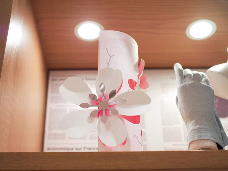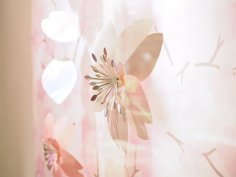 麗らかな春、桜が舞うような動きのあるディスプレイを表現したかったので、立体感と奥行きのある「ハンマートーンGA ばら」、なめらかで春らしい「OK ACカード うす桃」、二つの中間色で柔らかさを感じる「色上質 コスモス」を選びました。
